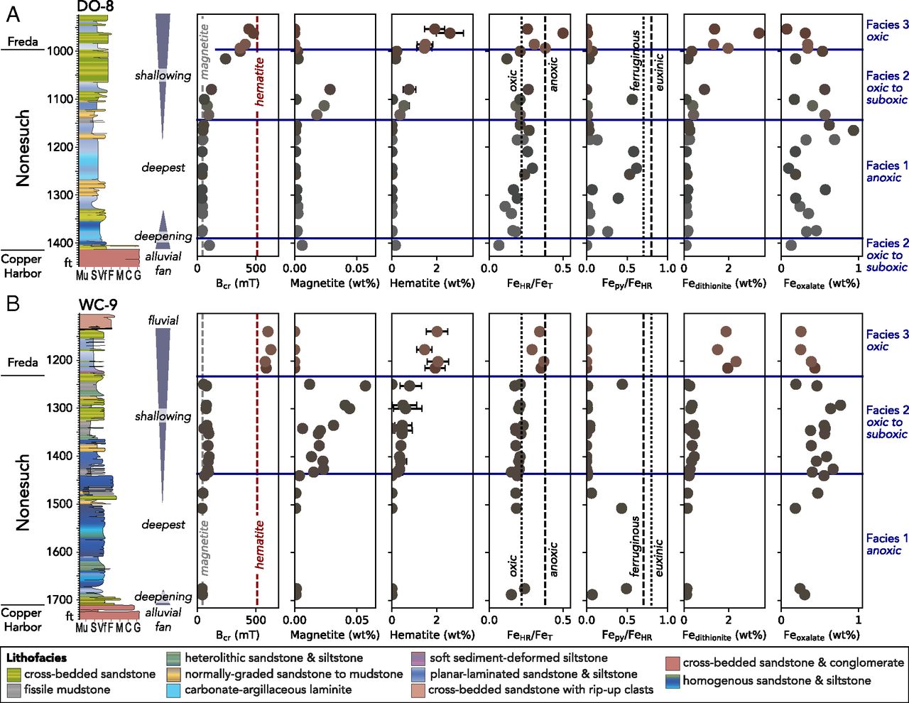 图3 Nonesuch组代表性钻井的磁性矿物学和铁组分地球化学剖面。自下而上,水体由深变浅,沉积环境由缺氧变氧化(Slotznick et al., 2018)