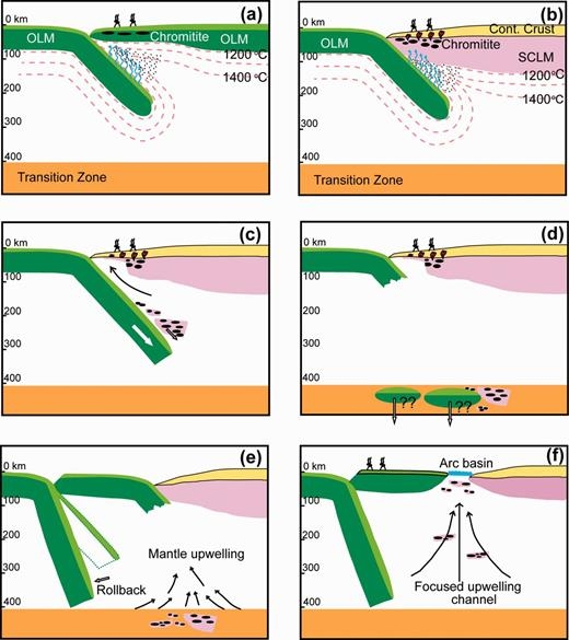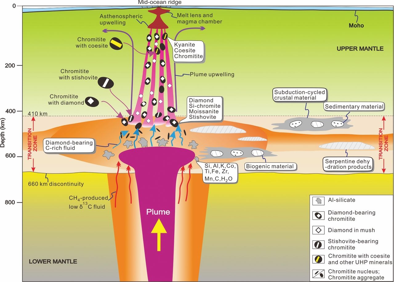 钻石恒久远,一颗永流传,这句深入人心的广告,让钻石变得既神秘又高贵。自然界很少有矿物能够像钻石那样家喻户晓,又人见人爱。除了由于其折射率高、色散性能强等优点被作为奢侈的工艺品外,金刚石也由于其硬度高、热导性好等性能而被广泛应用于工业界。 金刚石是由碳元素组成,是碳元素在高压下的同素异形体,通常认为金刚石在地幔中的稳定深度应该超过120公里,只能由少数来源于深部地幔的碱性岩浆(如金伯利岩、钾镁煌斑岩)携带至地表。金刚石在榴辉岩等变质岩中也有报道,表明地壳岩石曾经俯冲到深部发生超高压变质后发生折返。我国科学家在20世纪80年代就从西藏罗布莎蛇绿岩的铬铁矿中通过人工重砂方法分选出金刚石,但一直被怀疑是选样过程中可能发生混染而未得到国际学术界的承认。随着金刚石在全球其它蛇绿岩铬铁矿中的发现,尤其在薄片上原位金刚石的发现,使得人们相信蛇绿岩中的金刚石不是由于混染造成的。 除了金刚石外,其它一些超高压矿物(如柯石英)也在铬铁矿中陆续被发现和报道(Yang et al., 2007)。此外,罗布莎铬铁矿中的出溶矿物以及显微结构也表明它们曾经历13 GPa以上的超高压变质过程(Griffin et al., 2016)。而与这些超高压矿物相伴生的还有一些只有在超还原条件下才能形成的矿物,如碳化硅、方铁矿和自然铁等。通过与实验岩石学结果对比,科学家认为这些超高压矿物和超还原矿物可能来自440公里深处的上、下地幔转换带(Griffin et al., 2016)。 这些认识对传统的蛇绿岩成因模型提出了很大的挑战。蛇绿岩代表了残存的古大洋岩石圈,是软流圈在洋中脊发生部分熔融的产物。一般认为,软流圈地幔在洋脊下方熔融的深度通常不超过60公里。目前,对于这些超高压矿物如何从地幔转换带被携带至浅部后又随蛇绿岩构造就位于地表存在自上而下和自下而上两种不同的机制(图1),前者强调铬铁在浅部形成后发生深俯冲至地幔转换带,包裹超高压和超还原矿物后又发生快速折返(Griffin et al., 2016),而后者则强调,来自更深处(有可能是核幔边界)的地幔柱上升穿过地幔转换带时,裹携这些含有超高压和超还原矿物的铬铁矿至洋中脊下方(Yang et al., 2014)。无论是哪种机制,如果这些超高压和超还原矿物的确被证实来自地幔转换带,那无疑极具科学意义,因为这些蛇绿岩有可能代表了来自地幔转换带的真实样品,它们是我们了解与窥探深部地幔为数不多的窗口。