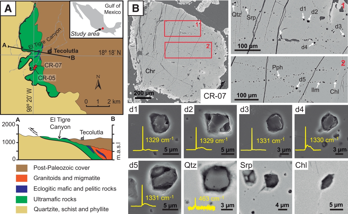 图1 蛇绿岩型金刚石的自上而下(左)和自下而上(右)两种机制。自上而下机制认为铬铁矿在浅部形成后俯冲到地幔转换带后发生超高压变质,然后携带超高压和超还原矿物折返至地表(Griffin et al., 2016)。自下而上机制则强调铬铁矿和超高压、超还原矿物一直位于地幔转换带,是被地幔柱携带至浅部(Yang et al., 2014) 然而,对于蛇绿岩中金刚石形成的压力及其形成机制一直争议不断,尤其是已有的理论与实验研究都表明超基性在低压条件下蛇纹岩化蚀变过程中可以形成金刚石(Simakov et al., 2018)。Farré-de-Pablo等(2018)在GEOLOGY上报道了蛇绿岩中金刚石可能形成于低压条件下的实例。他们对墨西哥Tehuizingo蛇绿岩中铬铁矿开展了详细的矿物学与地球化学研究,发现铬铁矿的化学成分明显具有边结构。铬铁矿的边部发生明显蚀变呈海绵结构,并含有大量的绿泥石和蛇纹石包裹体,而核部相对新鲜未发生蚀变,但发育有愈合的裂隙。铬铁矿的核部相对边部具有更低的Cr#和Fe3+值,而核部裂隙边缘的铬铁矿成分与边部蚀变的铬铁矿类似。在核部已愈合的裂隙中,发现有原位的金刚石(直径1-8 um),同时还伴生有蛇纹石、绿泥石和石英等低温蚀变矿物(图2)。 作者利用Perple_X温压软件模拟获得核部裂隙的蚀变温度为670 oC -515 oC,而蚀变边的形成温度为410 oC -340 oC。作者提出Tehuizingo铬铁矿中的金刚石形成于低压条件下(即石墨稳定区)橄榄岩的低温退变质过程(图3),即蛇纹石化过程中有富CH4、H2的还原性流体参与,而水岩反应导致原本碳不饱和的C-O-H流体最终达到碳饱和,从而结晶出金刚石。