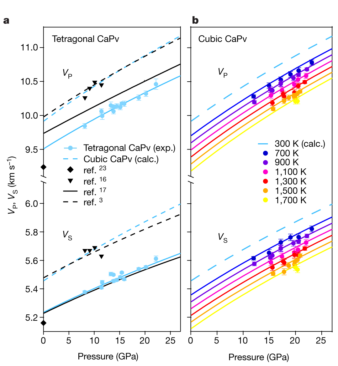 CaSiO3钙钛矿(以下简称CaPv)是地幔转换带(MTR,410-660km)和下地幔(660-2900 km)中的重要矿物组分。前人的计算模拟与高温高压实验均表明,CaPv在高压下会随温度的升高而从四方结构转变至立方结构,但对于该相变的温压边界以及立方结构CaPv的弹性波速还存在很大争议。从高温高压实验角度,立方结构CaPv不能淬火至常温常压,因而常规分析手段不再适用,而在同时高温高压条件下原位测量矿物的热弹性性质一直都是极具挑战的研究。