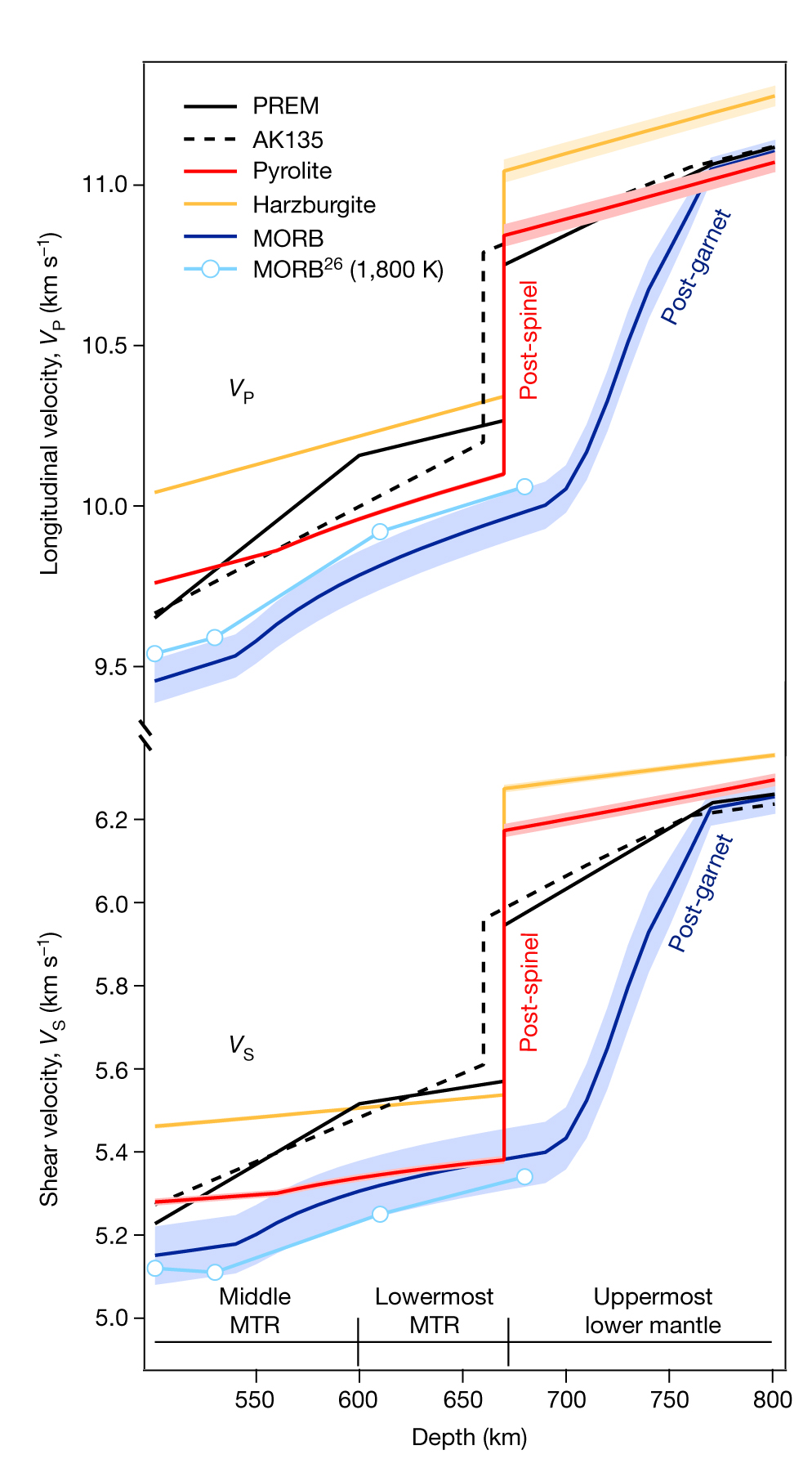Gréaux等人进一步地将他们的CaPv弹性数据和前人的实验研究结合起来,沿着地温曲线估算了各种地幔岩石模型的VP和VS值(图3)。他们认为510-600 km深度范围内方辉橄榄岩的含量逐渐增加,并且地幔转换带下部(600-660 km)以纯的方辉橄榄岩为主要成分,这能够很好地解释地幔岩(红线)的波速与地震观测模型(黑线)的偏差。而在下地幔顶部(660-770 km)区域,依据他们新的立方结构CaPv波速实验数据,Gréaux等人发现MORB的波速要明显低于地幔岩模型(图3),因此如果在地幔岩中混入20-30vol%的MORB,这可以大大降低该区域的波速并使之与地震观测模型相符。