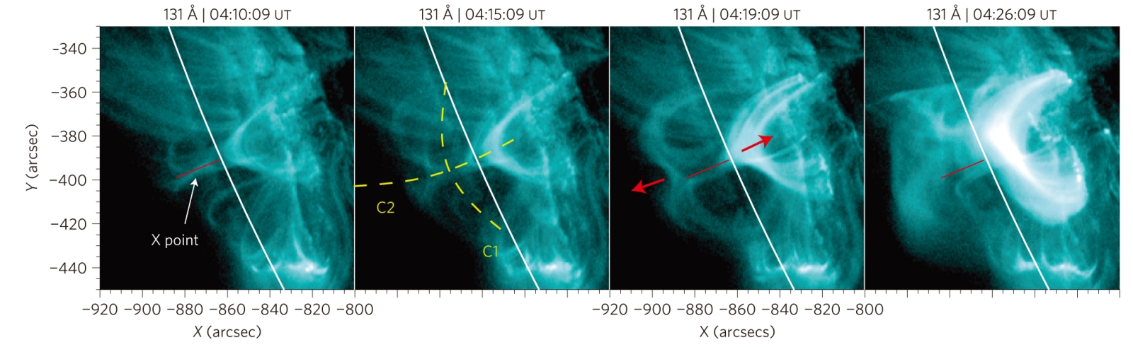 图1 NASA太阳动力学天文台(SDO)在2011年8月17日观测到一起在太阳表面的典型磁重联事件(Su et al., 2013),在此过程中,磁场的拓扑发生了显著的变化。AIA成像仪在131埃波段观测到被加热到10MK的等离子体结构。分开的红色箭头表示正处在磁重联出流区的热化磁环