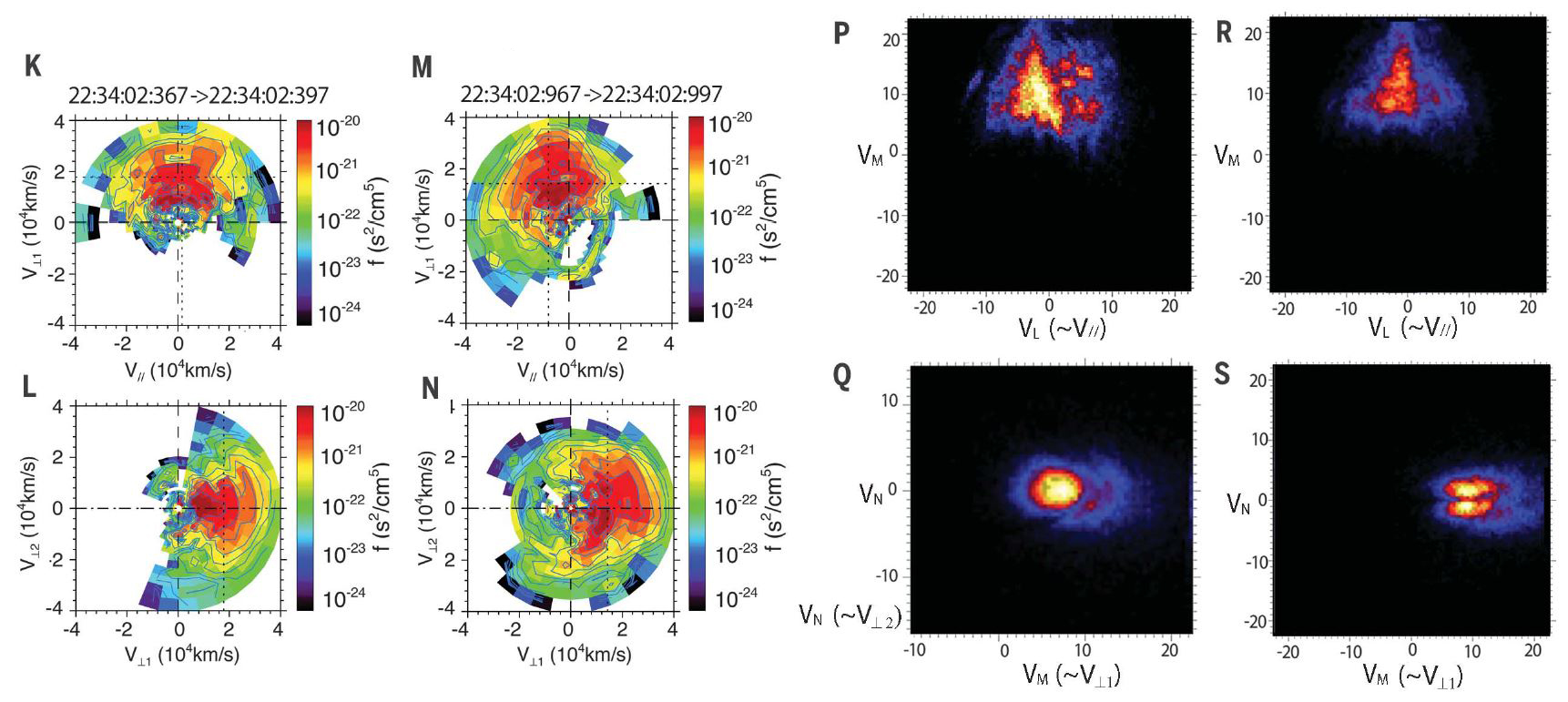 图3 K-N:MMS星座在磁重联电子扩散区里观测到的电子速度分布存在多新月形分布;P-S:数值模拟在此区域内重现的电子速度分布(Torbet et al., 2018)