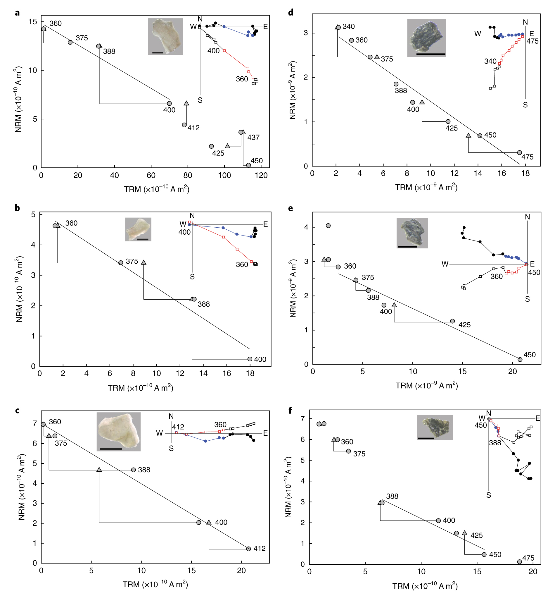 单晶硅酸盐记录的古地磁场强度。其中,NRM代表天然剩磁,TRM代表热剩磁,右上角插图为退磁矢量投影图,表示样品记录的古地磁场方向(Bono et al., 2019)