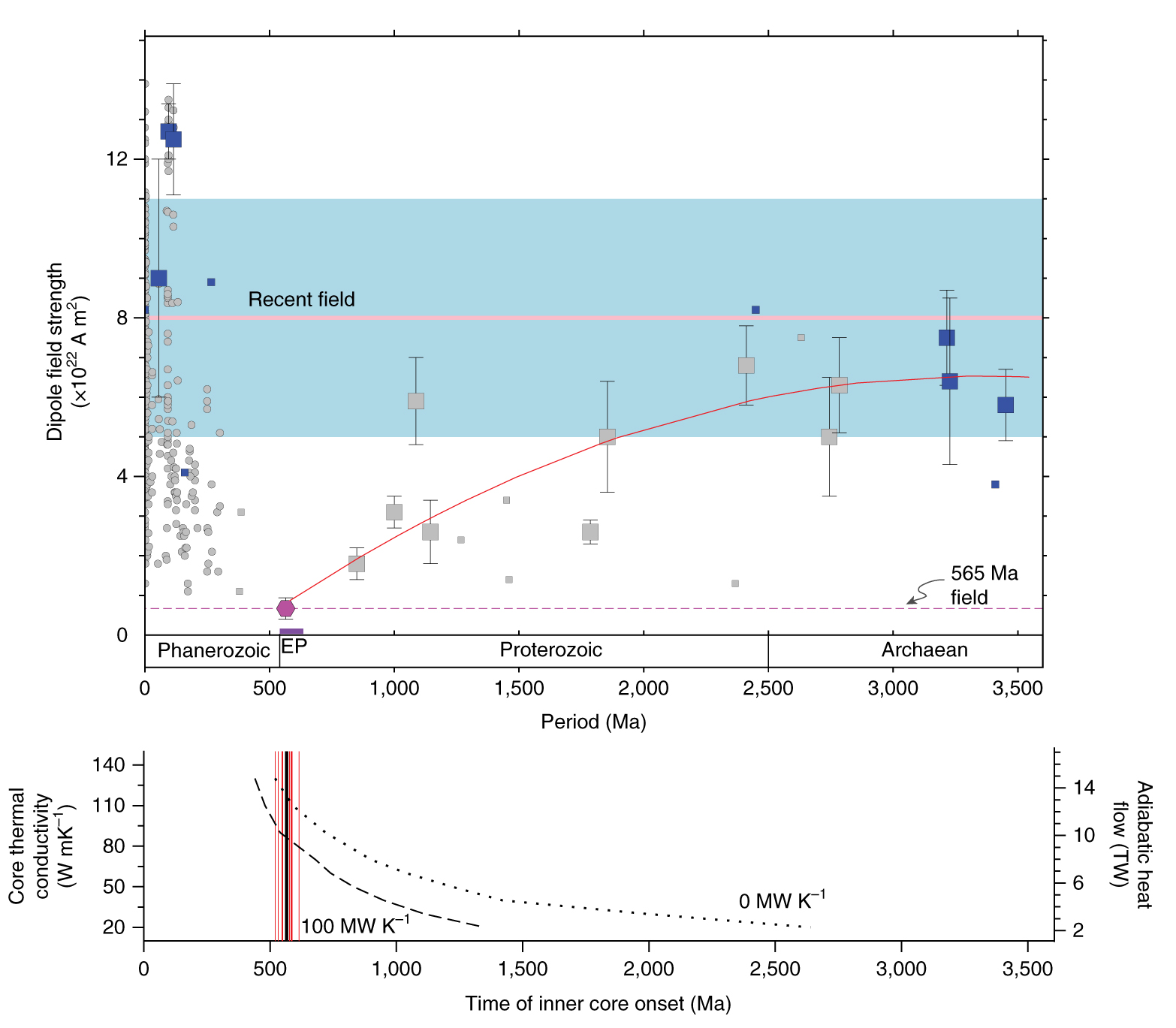 Bono R K, Tarduno J A, Nimmo F, et al. Young inner core inferred from Ediacaran ultra-low geomagnetic field intensity[J]. Nature Geoscience, 2019, 12(2): 143-147.(原文链接)