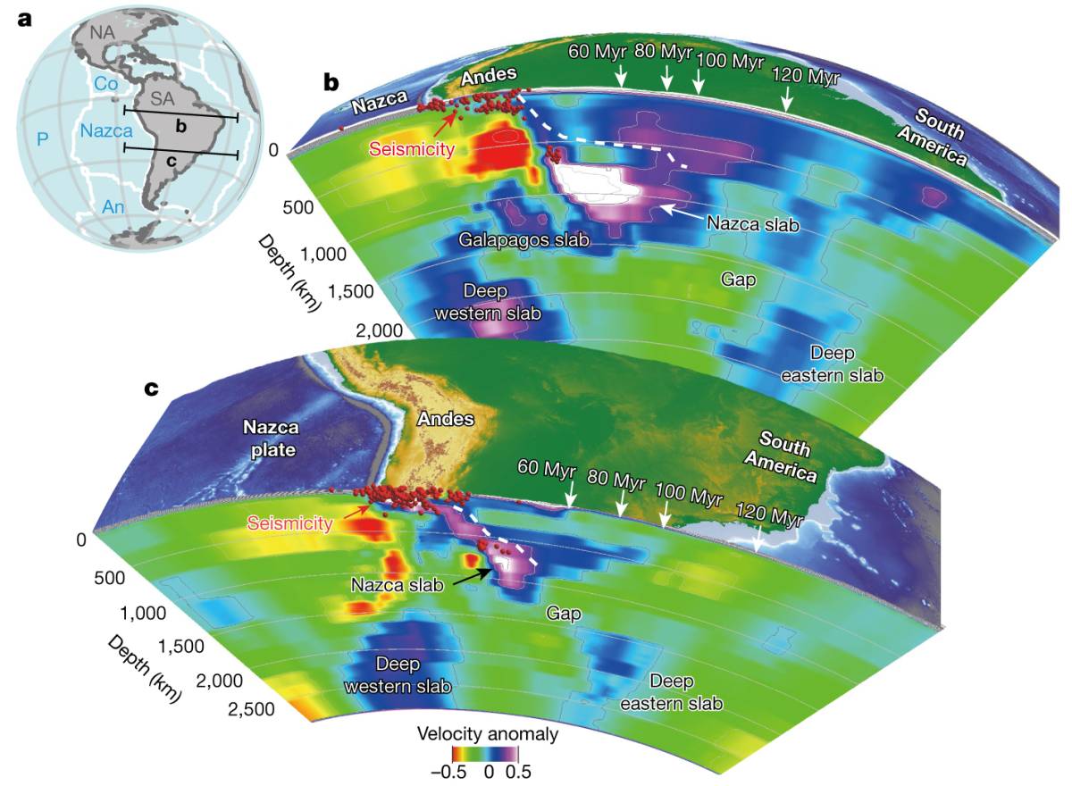 图2 地震层析成像揭示南美下方存在多个俯冲板片(Chen et al., 2019)