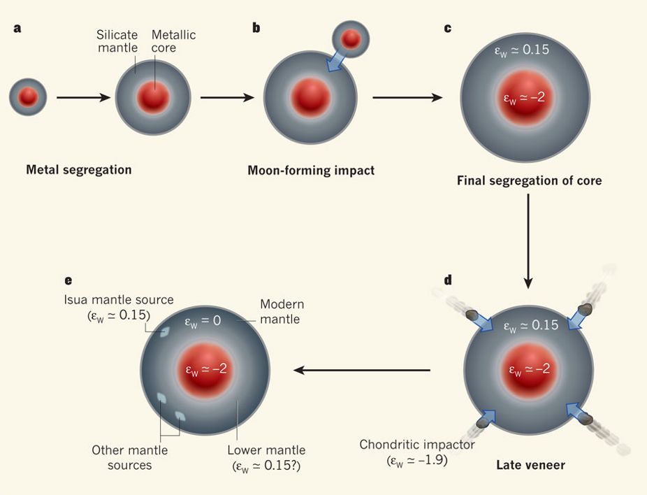 图1 地球早期演化示意图。(a)原始地球是一个足够大的天体,其核幔分异的时间可早至4500 Ma前;(b)~4500 Ma在地球核幔还未完成分异时,一个火星大小的天体撞击了地球,形成了现在的地月体系,该事件称为大撞击(Giant impact);(c)在较短的时间内地球核幔完成分异,地核的ew约为-2,地幔的ew约为0.15;(d)~4500-3800 Ma,有不断的小行星撞击早期的地球,加入大量球粒陨石,该事件称为后增生(Late veneer), 其主要证据是地壳样品的铂族元素异常;(e)后增生加入的物质导致地幔的ew降低至0,同时可能还存在未充分混匀的原始地幔(如格陵兰Isua的岩石)(Kleine, 2011)