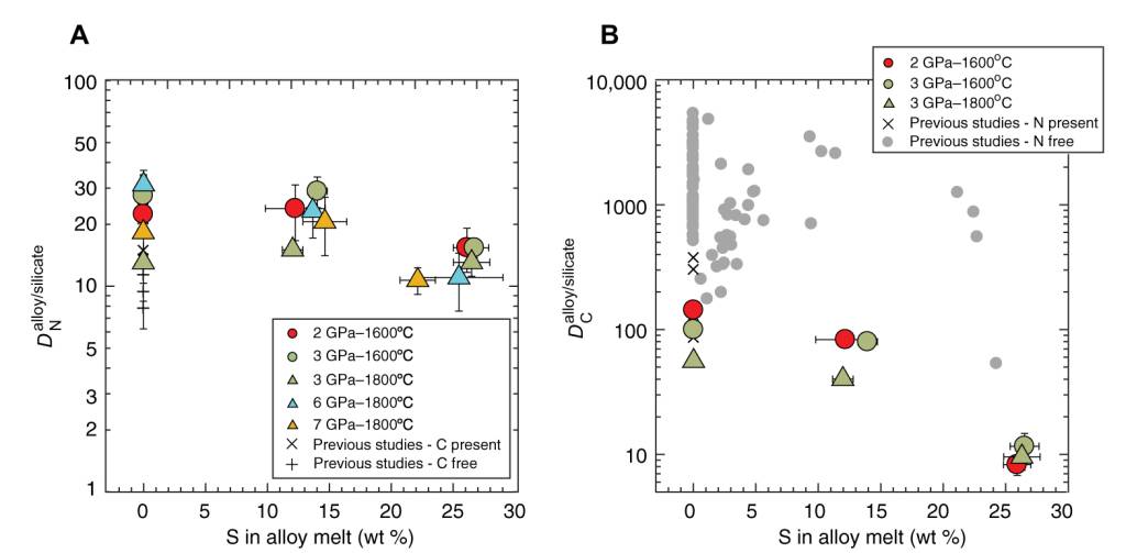 图2 N和C在金属和硅酸盐熔体的分配系数与金属熔体中S含量的相关性。(A)在相同温压条件下,N在金属和硅酸盐熔体的分配系数随S在金属熔体的含量无显著变化。(B)当金属熔体含N时,C在金属和硅酸盐熔体的分配系数随S在金属熔体的含量增加,存在一个数量级的降低(Grewal et al., 2019)