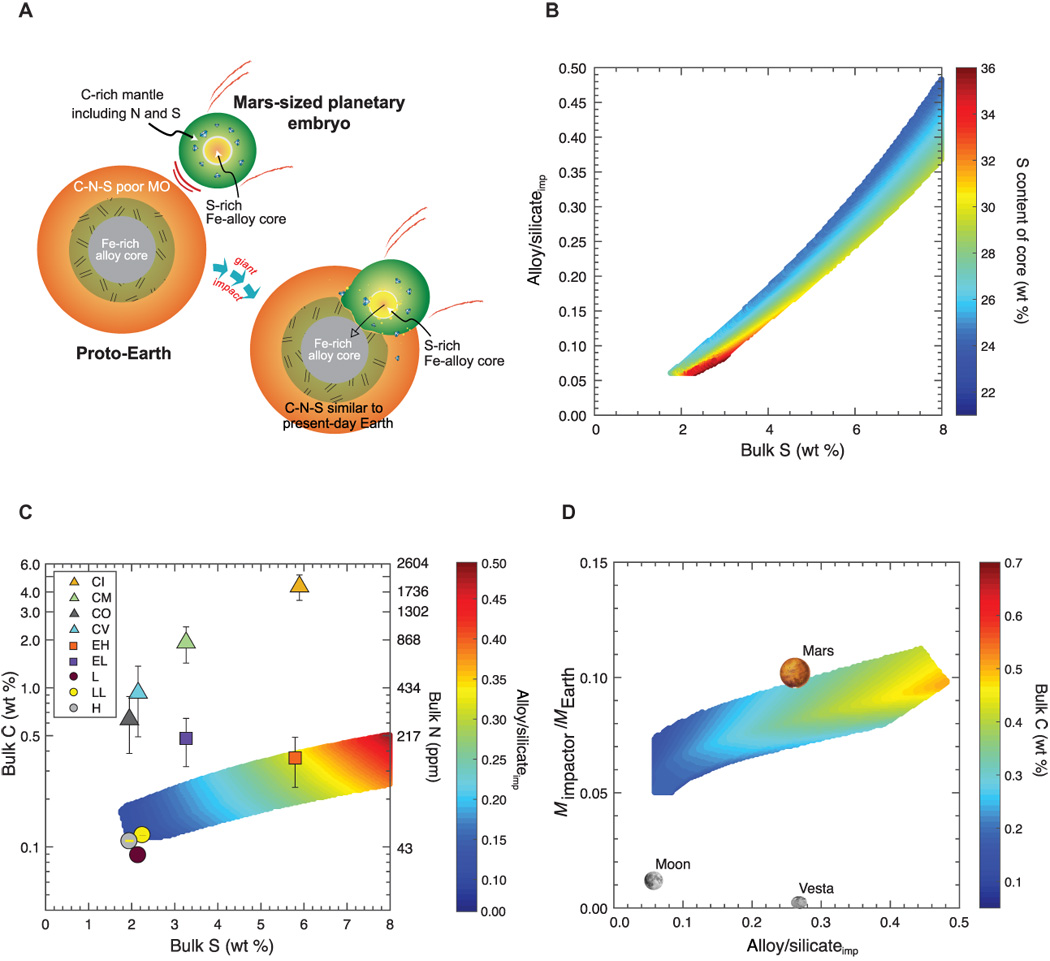 图3 C-N-S通过大撞击加入原始地球的示意图与撞击体化学成分和大小的计算机模拟。(A)一个C饱和与富S核部的撞击体加入贫挥发分的原始地球的示意图;(B)撞击体金属与硅酸盐比值与全岩S含量与撞击体金属核S含量的相关性;(C)撞击体全岩C含量与全岩S含量及撞击体金属与硅酸盐比值的相关性,其他球粒陨石也投在图中作为对比;(D)撞击体的质量与火星大小相当(Grewal et al., 2019)