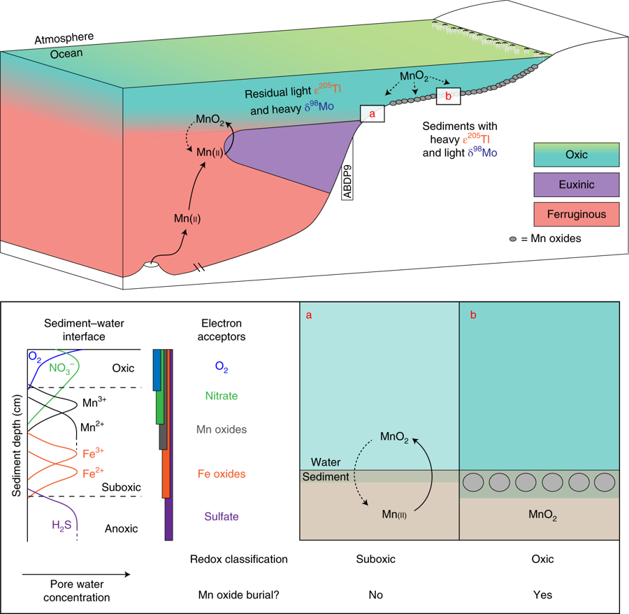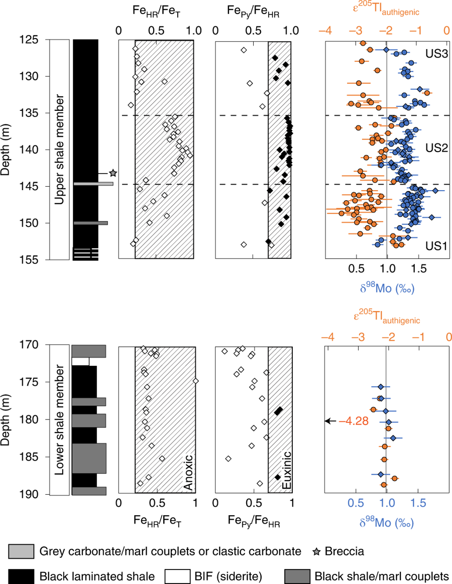 这是第一次在同一组页岩样品中测量两种同位素系统,正如预期的那样,他们发现页岩上部的较轻的铊(Tl)和较重的钼(Mo)两种同位素呈反相关关系(图2上),表明当时Mn氧化物已埋在了大片区域的海底,也就是说,25亿年前的浅水大陆架上已经存在充足的O2。