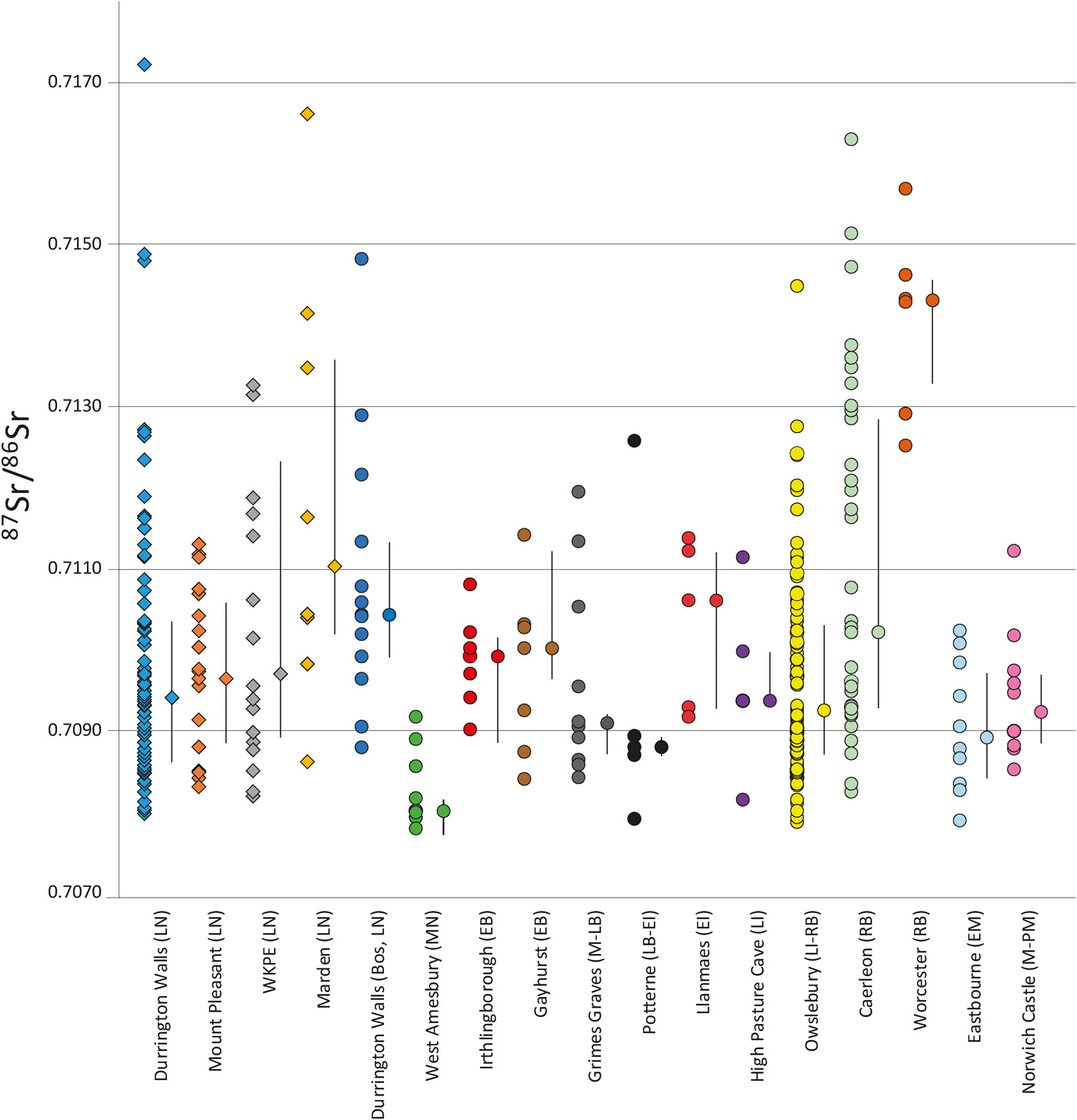图1 四个研究遗址点与英国境内其它不同时期遗址点动物锶同位素对比(4个遗址点分别为Durrington Walls, Mount Pleasant, West Kennet Palisade Enclosures和Marden遗址,LN为新石器时代晚期,MN为新石器时代中期,EI为早期铁器时代,RB为罗马-不列颠时期,EM为中世纪早期)