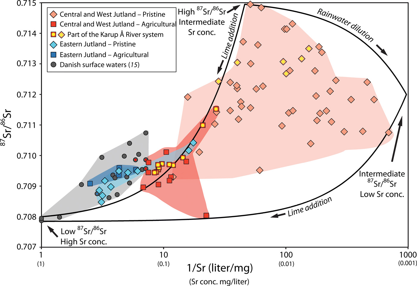 尽管锶同位素是探讨迁移行为的强有力证据,作者也承认,即使用5种同位素共同约束,仍然无法准确判断这些猪的具体来源。目前,判断动物与人类来源的有效方法是建立高分辨率的锶同位素背景值,主要载体为生物可利用的地表水、地下水、植物及迁移能力较弱的动物(Evans et al., 2010)。然而,丹麦奥胡斯大学Thomsen and Andreasen (2019)最近发现,丹麦西部不受污染的地表水87Sr/86Sr平均值(0.7124)相对于其农田附近值(0.7097)明显偏高,而Sr浓度明显偏小(图3)。作者认为,这可能与农业中非钙质土中施撒石灰有关,该行为导致地表水的Sr浓度升高和87Sr/86Sr值降低。因此,在建立Sr同位素背景值时,农业活动的影响不能忽视。该成果同一天在Science Advances上发表。此外,存在的问题还包括:锶同位素难以区分地质背景相似地区的人口迁移、牙釉质和骨骼样品可能受到后期污染等。