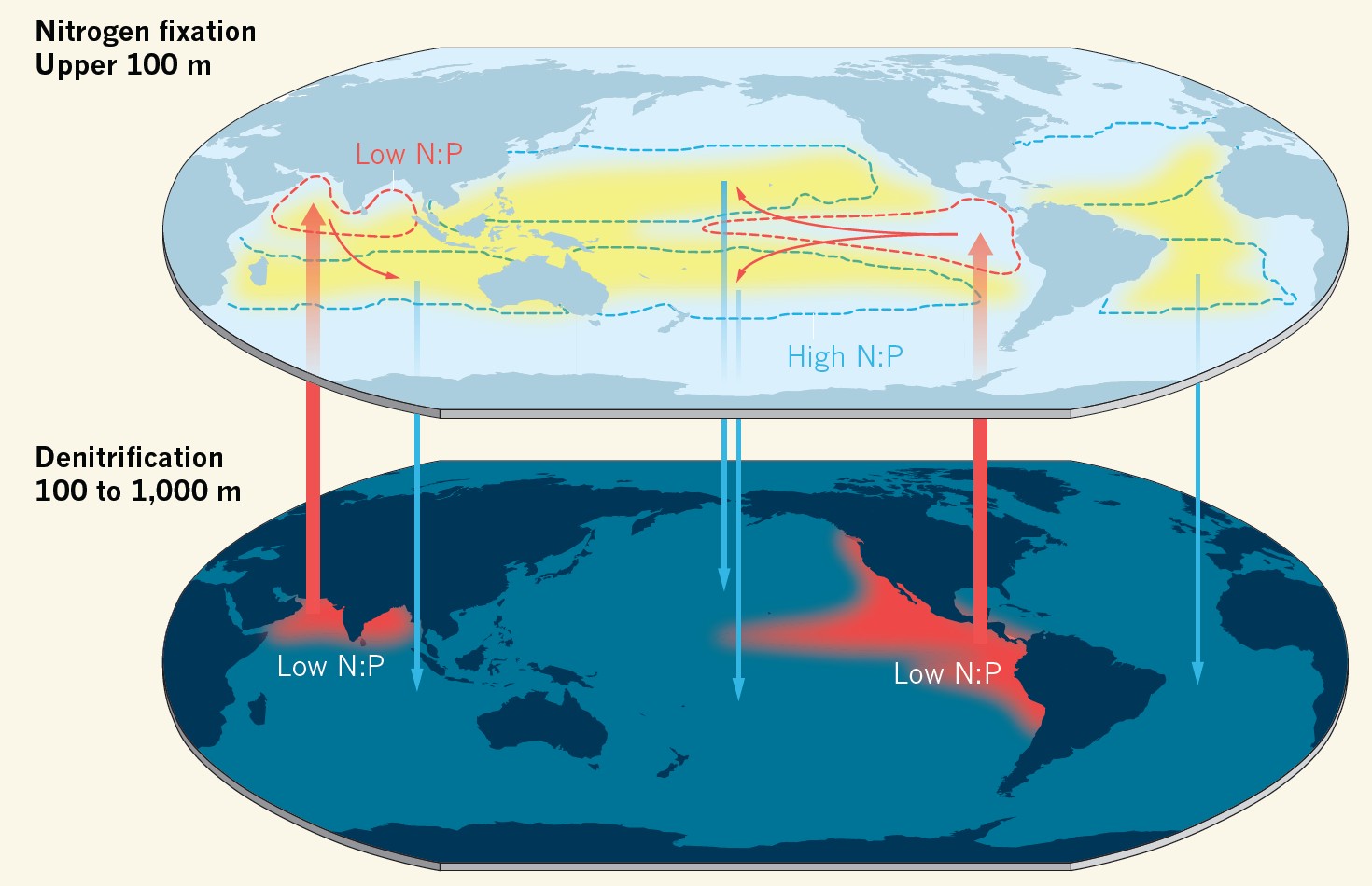 图3 海洋固氮作用和反硝化作用的联系 (Gruber, 2019)。在表层海水(<100米),固氮微生物将海水里溶解的N2转化为其他生物可利用的氮化合物。在印度洋和热带东太平洋100–1000米深度海水里(红色区域),反硝化作用则将氮化合物还原为N2。反硝化作用海域的上升流水体具有非常低的N/P比值。Deutsch et al. (2007)通过地球化学P*方法模型推测海洋固氮作用主要发育于反硝化作用强烈的热带东太平洋和阿拉伯海等海域(即红色区域),但是Wang et al. (2019)的最新研究认为固氮作用主要发育于亚热带环流海域(黄色区域)。在该环流海域,强烈的固氮作用促进生成高N/P比值的生物质,随后向下沉降至海洋深处(蓝色箭头),循环补充经反硝化作用丢失的N,维持着海洋N循环的稳定