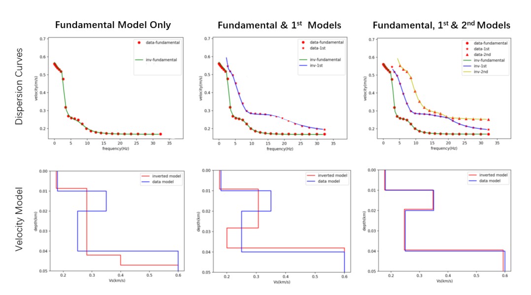 总之,高阶面波信息对结构反演至关重要。仅仅使用基阶信息的地震面波反演很难成为独立的、高精度的结构成像方法。我们提出的矢量波数变换方法(F-J Method),可以有效提取多阶面波信息。基于F-J Method,我们发展了多阶面波反演方法。这一进展表明:地震面波(主动源、被动源)成像方法,在充分利用多阶频散信息基础上,有望成为一种独立的、具有较高精度的地球内部结构(深、浅)成像方法。