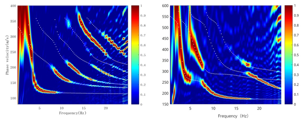 图2 不同理论模型的多阶面波频散曲线提取结果(左:基于模型2的频散曲线;右:基于模型1的频散曲线。具体模型参数可参考Wang et al., 2018)