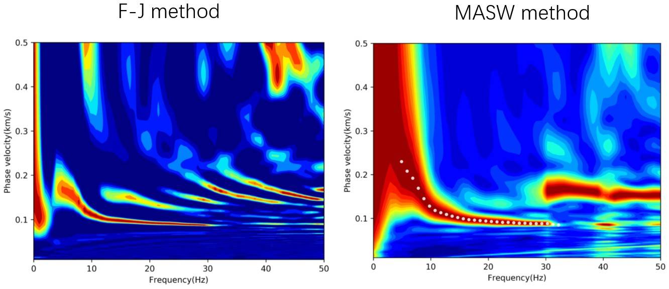 既然多阶面波反演如此重要,那么为什么以往不做多阶面波反演呢?因为以往的分析方法当中很难从实际资料中提取到高阶面波信息,基于此,我们开发了一种频率-矢量波数域变换法(frequency-vector wavenumber transform method,F-J 方法)来提取多阶面波信息。