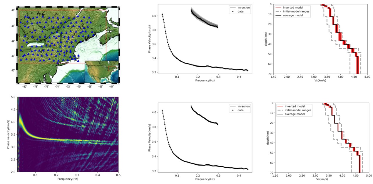 背景噪声成像方法,可以从噪声中提取出面波,通过对获取的噪声信息进行相关、叠加,便可以获取包含有面波信息的经验格林函数。然后利用测量频散曲线的双台法等方法,便可以获取背景噪声中的频散曲线。相比于天然地震资料,背景噪声获取的频散曲线,频率更高,周期更短,可以获得更精细的结构。