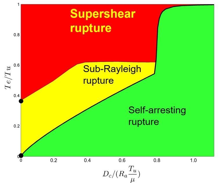 利用边界积分方程方法,我们发现地震破裂总体而言,存在三种破裂形态:第一种是超剪切破裂(supershear rupture),其破裂速度大于剪切波速度;第二种是亚剪切破裂(sub-rayleigh rupture),其破裂速度始终不超过剪切波速度;第三种我们称之为自停止破裂(self-arresting rupture)。前两种破裂,只要模拟的时间足够长,破裂会一直进行下去,但是对于自停止破裂,破裂传播到一定程度,它就会自己停止。
