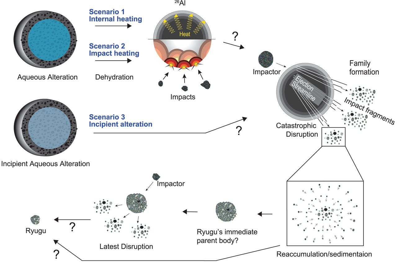 2 Ryugu形成的示意图(Sugita et al., 2019)。最初吸积形成的Ryugu母体发生过强烈的水蚀变,由于26Al衰变和撞击加热,导致该母体发生脱水,同时导致母体破碎。撞击形成的碎块重新吸积形成小行星,可能后期还经历过较强的撞击从而形成现在的Ryugu