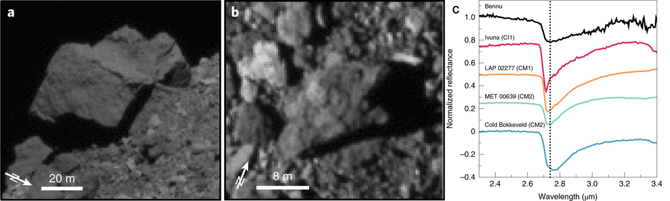 图4 abBennu表面不同大小的岩石(Walsh et al., 2019);(cBennu与不同碳质球粒陨石的光谱。2.74 um处为Bennu吸收峰位置(Hamilton et al., 2019)