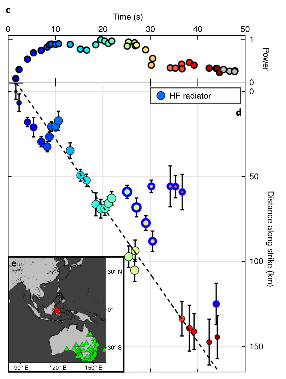 图1 帕卢地震的地表破裂轨迹和超剪切破裂速度(Bao et al., 2019)。(c)Beam Power随时间的变化。(d)反投影获得的能量源沿走向的时间与位置。时间表示相对于起始破裂的时间,距离是相对于震中的水平位置沿走向(174°)的投影。(e)所用到的澳大利亚台站分布