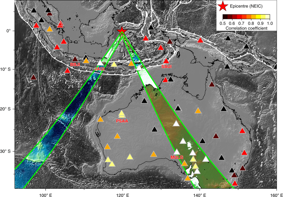 图2 远场瑞利波马赫锥的证据(Bao et al., 2019)。绿线内的彩色区域是马赫锥,马赫锥根据观测的破裂速度(4.1 km/s),并考虑到瑞利波相速度的不确定性,以最大可能的马赫角扫描获得