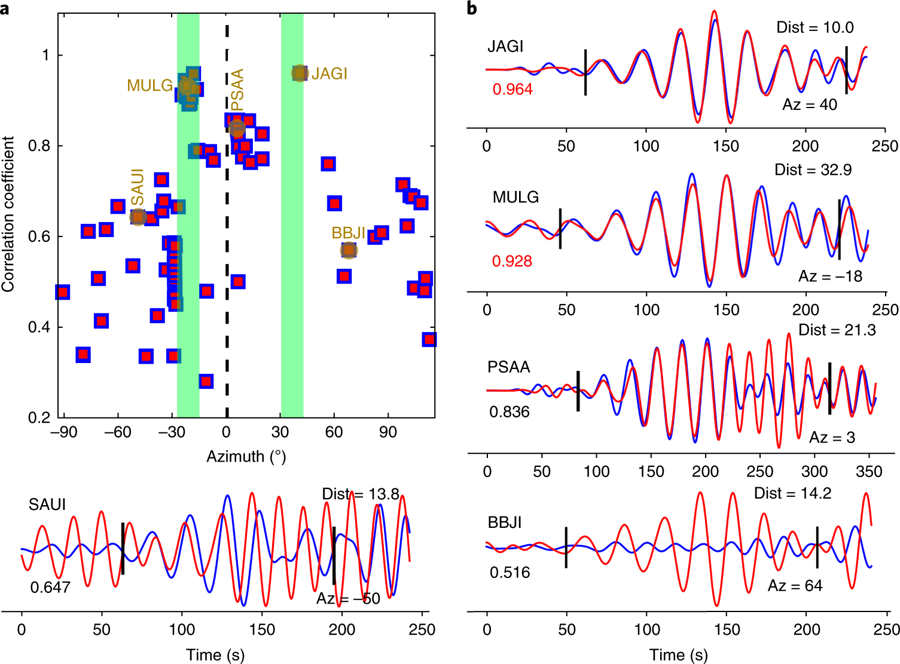 图3 瑞利马赫波的证据(Bao et al., 2019)。(a)主震15-25s瑞利波与其M 6.1前震波形的相关系数随相对于破裂走向的方位角变化图,两个绿色条带表示估计的马赫锥方位角的可能范围。(b)15-25s周期的主震(蓝色)和前震(红色)的瑞利波垂直位移记录。前震信号通过主震/前震地震矩比(大小为125)进行缩放
