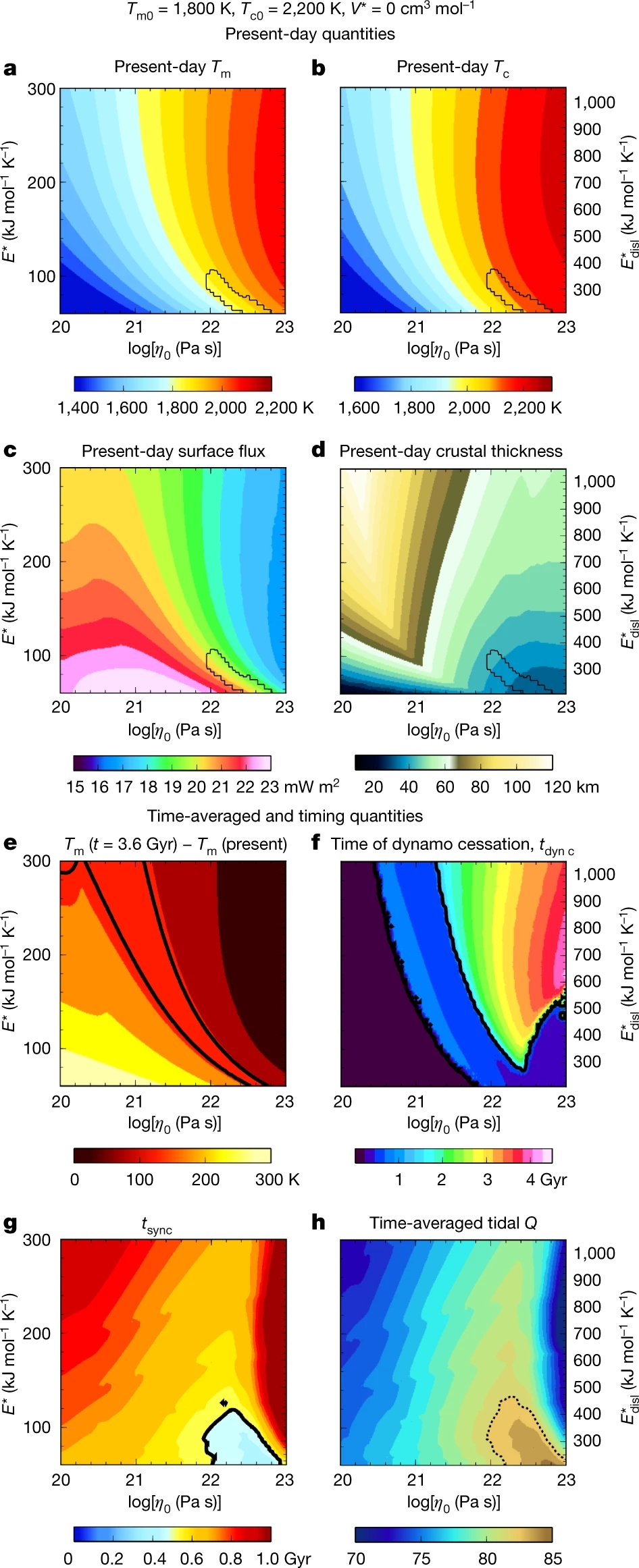 图1 探索火星与火卫一的热-轨道演化。初始地幔温度Tm0 =1800 K, 初始地核温度Tc0 = 2200 K,活化体积V*= 0 cm3 mol?1。(a–d).现今值;(e–h).时间平均和定时值。每个图板代表在不同地幔参考粘度(η0)、有效(E*)或位错蠕变(Edisl=E/3.5)活化能情况下4096个热化学和轨道演化。e、f和h中的黑色曲线分别描绘的是Amazonian– Hesperian长期冷却的临界值(100–140 K)、早期火星热发动机的解以及火卫一到达同步轨道的(反向)时间。 h中的虚线代表时间平均的Q = 82. a–d中的黑色等值线代表满足热、磁和轨道约束的解