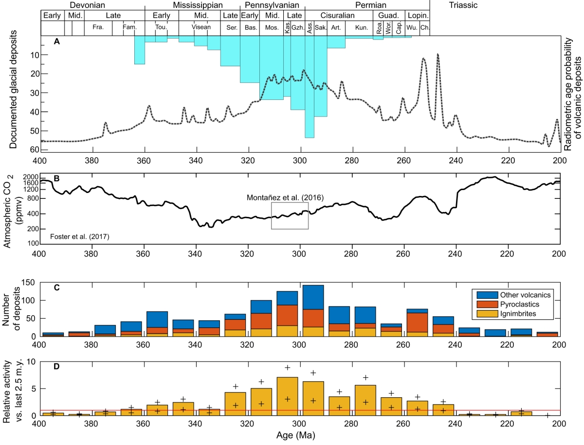 近日,美国俄克拉荷马大学的Gerilyn S. Soreghan和其合作者在Geology上发文,报道了晚古生代不同纬度的火山建造的年龄分布峰值与同时期的冰期沉积物的年龄分布峰值具有较好的一致性(图1A),他们认为大规模的火山喷发注入平流层的具有负辐射强迫效应的硫酸盐气溶胶能有效降低地球表面接收到的太阳辐射能,从而启动并维持近100 Myr的晚古生代大冰期。