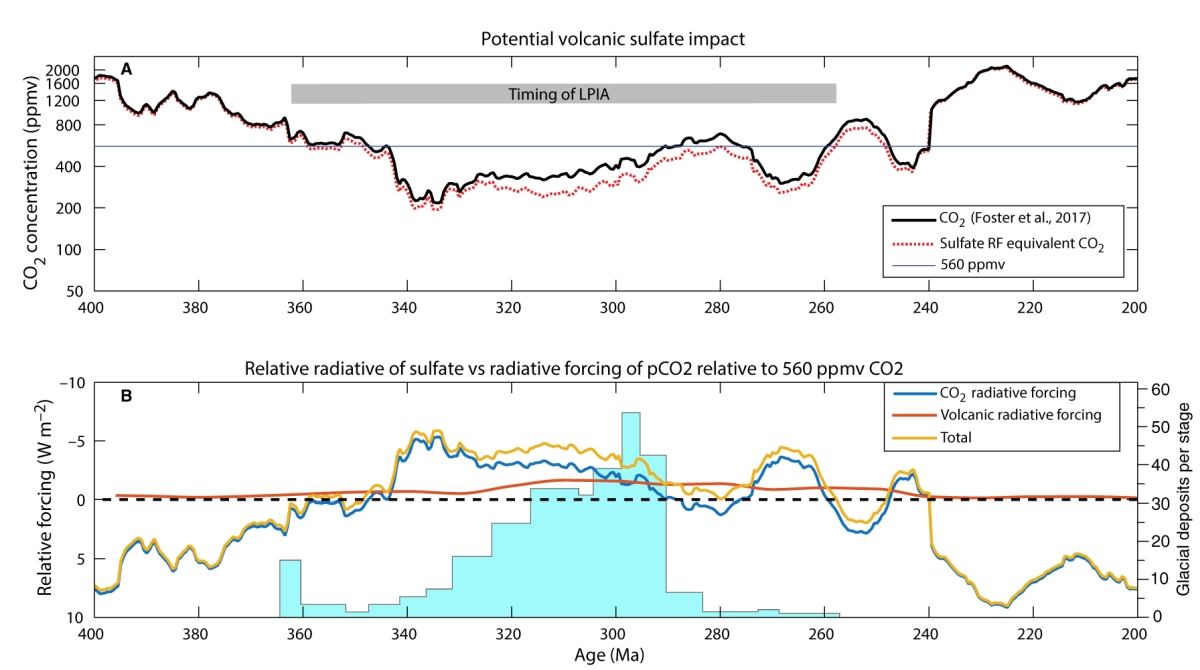 图2 (A)经负辐射强迫硫酸盐气溶胶校正前的CO2浓度(黑线)与校正后的实际CO2浓度(红虚线)对比图;(B)CO2和火山的辐射强迫与冰期发育时间的对比图,校正后的净辐射强迫(黄线)在340-260 Ma期间一直保持负值,使得冰期得以长期保持稳定