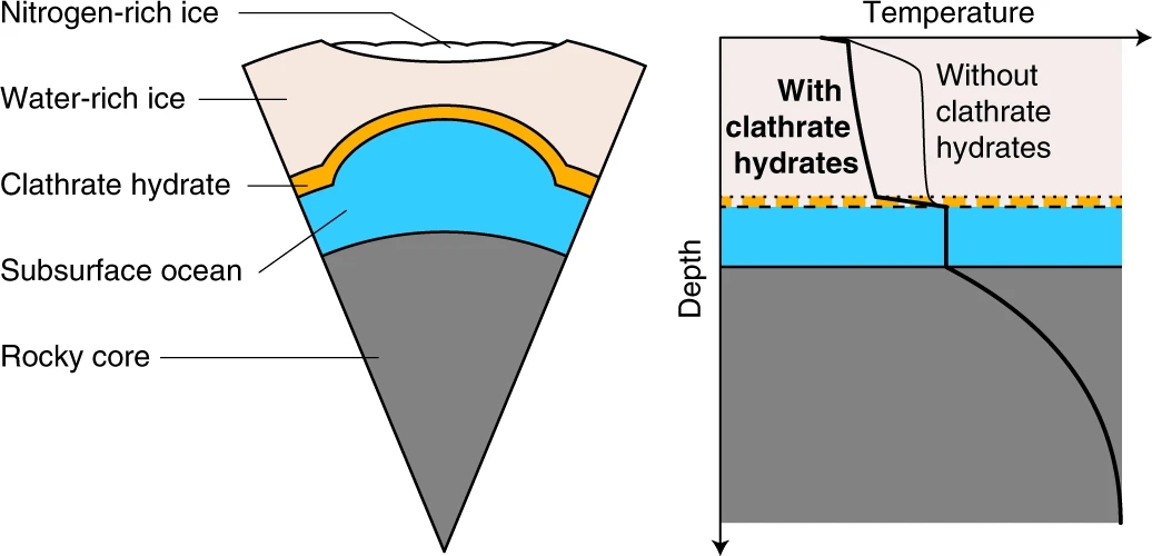 近日,日本北海道大学Shunichi Kamata et al.(2019)在Nature Geoscience上发表研究成果,提出了一种新的解释。他们认为冥王星的冰壳下方存在一个由气体水合物构成的隔热层。气体水合物是由气体构成的冰状固体,其中气体分子被禁锢在分子水的笼子中。气体水合物在冥王星内部压力条件下,能够在高于冰点的温度下形成,并且其热导率比水冰小5-10倍,其粘度比水冰高约一个数量级。正因为气体水合物层能够在形成水冰之前先形成,同时其高粘度和低热导率隔绝了热量的进一步损失,从而能够保证液态海洋的存在(图2)。