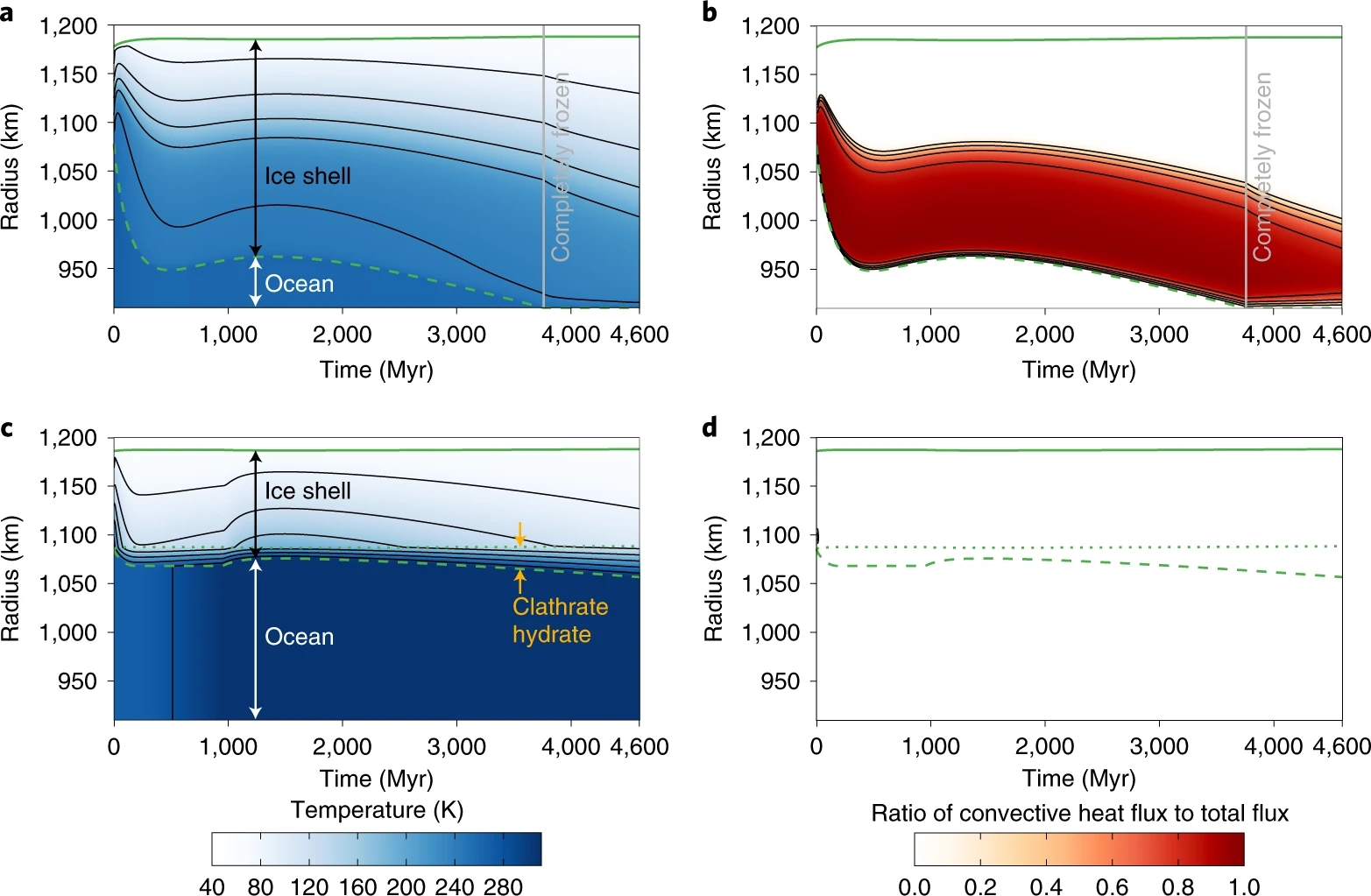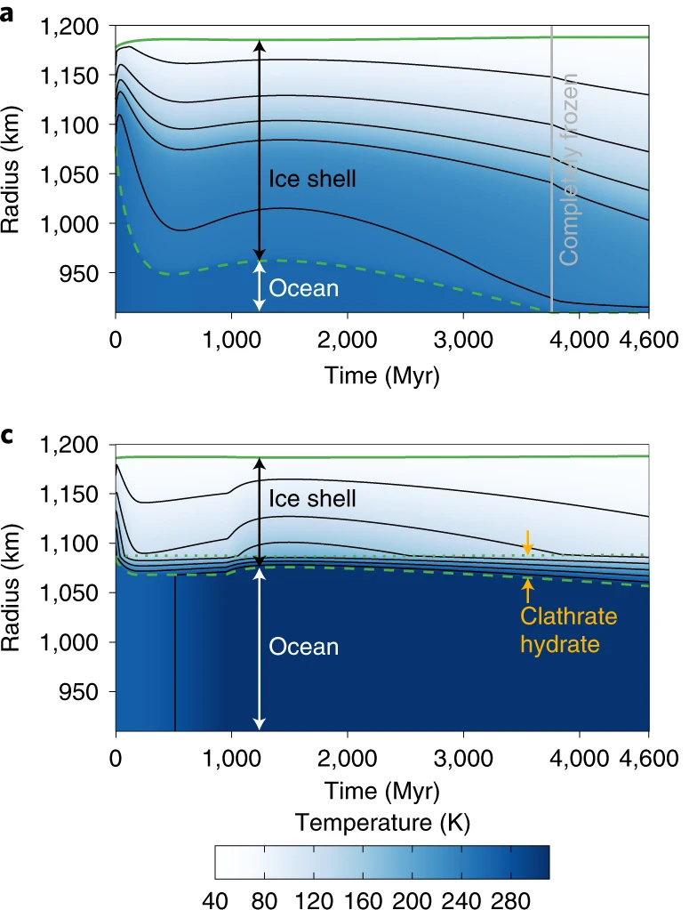 同时,Kamata等也开展了冥王星内部热演化的计算模拟,他们指出如果没有气体水合物,冥王星的地下海洋在几亿年前就已经冻结了(图3a),而添加这个隔热层后,这个液态海洋可以一直存在到今天(图3b)。