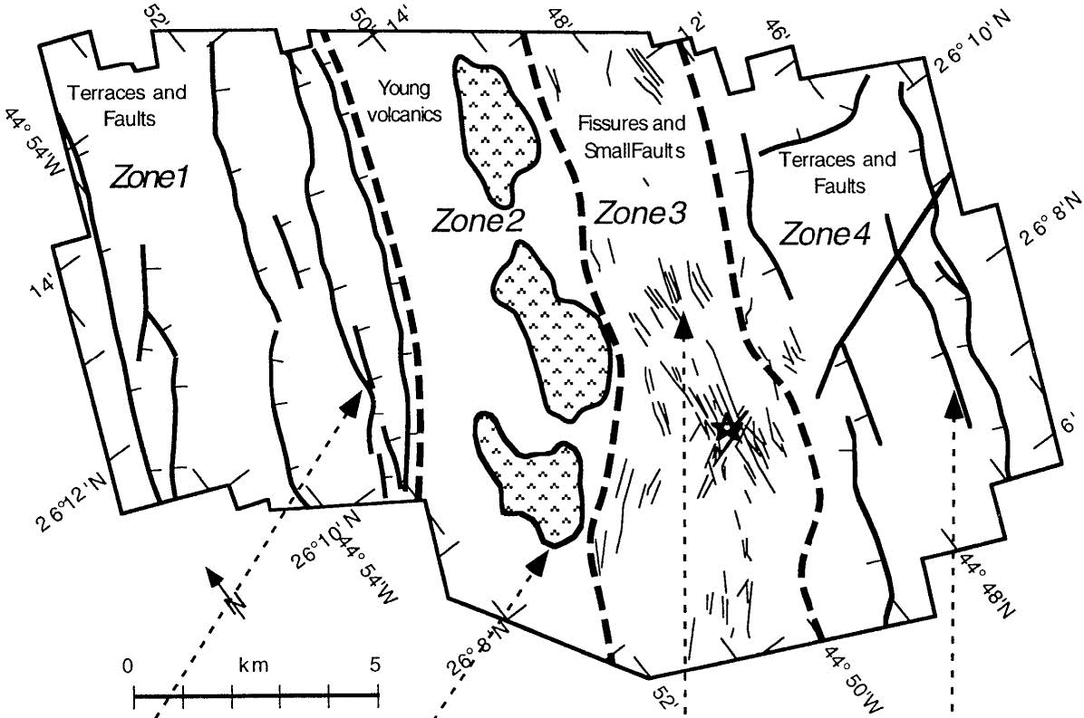 Rainbow热液活动区位于沿洋中脊Azores triple junction西南方500 km位置处,沿该段洋中脊,扩展轴由一系列非转换不连续和转换偏移边界的脊段组成,这些脊段大部分是右进的。(图9,Dunn et.al., 2017)本次调查实验覆盖了全部4处脊段,Rainbow地块以及其他地块用灰色虚线标出,黄色三角为Rainbow热液活动区。