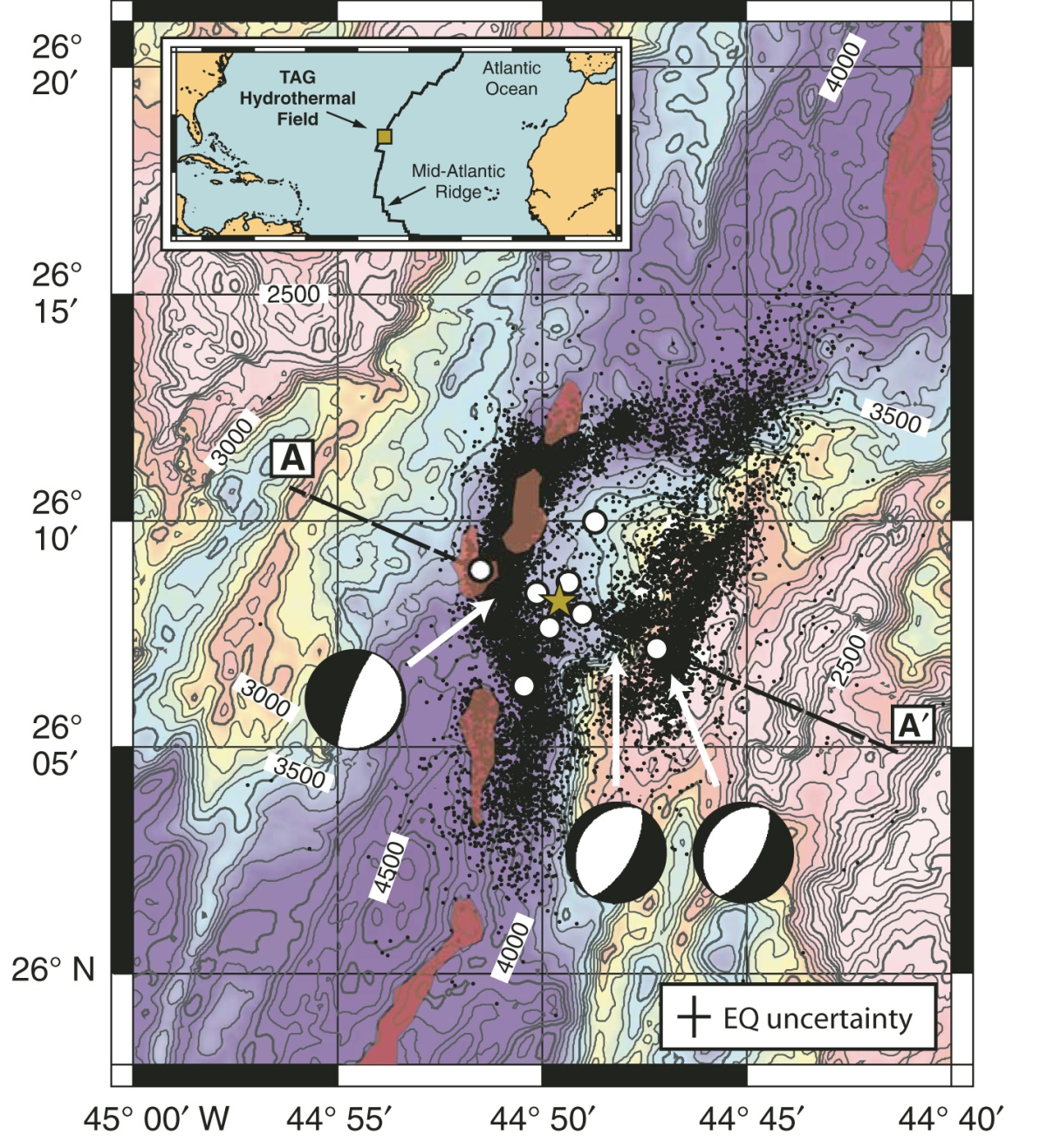 为探究中-大西洋中脊TAG热液活动区和Rainbow热液活动区成因,伍兹霍尔海洋研究所联合多家单位进行了多次的地球物理探测。
