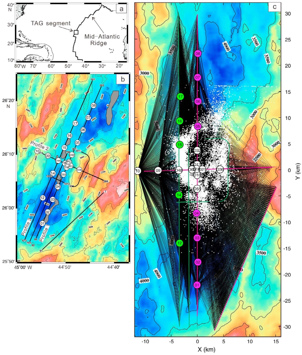 大西洋中脊TAG段3D海底地震仪观测如图6所示:(a)为TAG段所处位置;(b)OBS在水深图中位置,白色圆圈表示OBS,黑色实线为气枪震源轨迹(其上标有自小到大的炮号),阴影区为新火山带;(c)将经纬度坐标投影到笛卡尔坐标系下,红色OBS接收红色气枪震源信号,绿色则接收绿色气枪震源信号,白色OBS接收所有信号,白色小圆点表示Sohn et al (2007)提到过的地震事件,黑色实线链接震源和接收器,代表之后层析反演中用到的旅行时信息。
