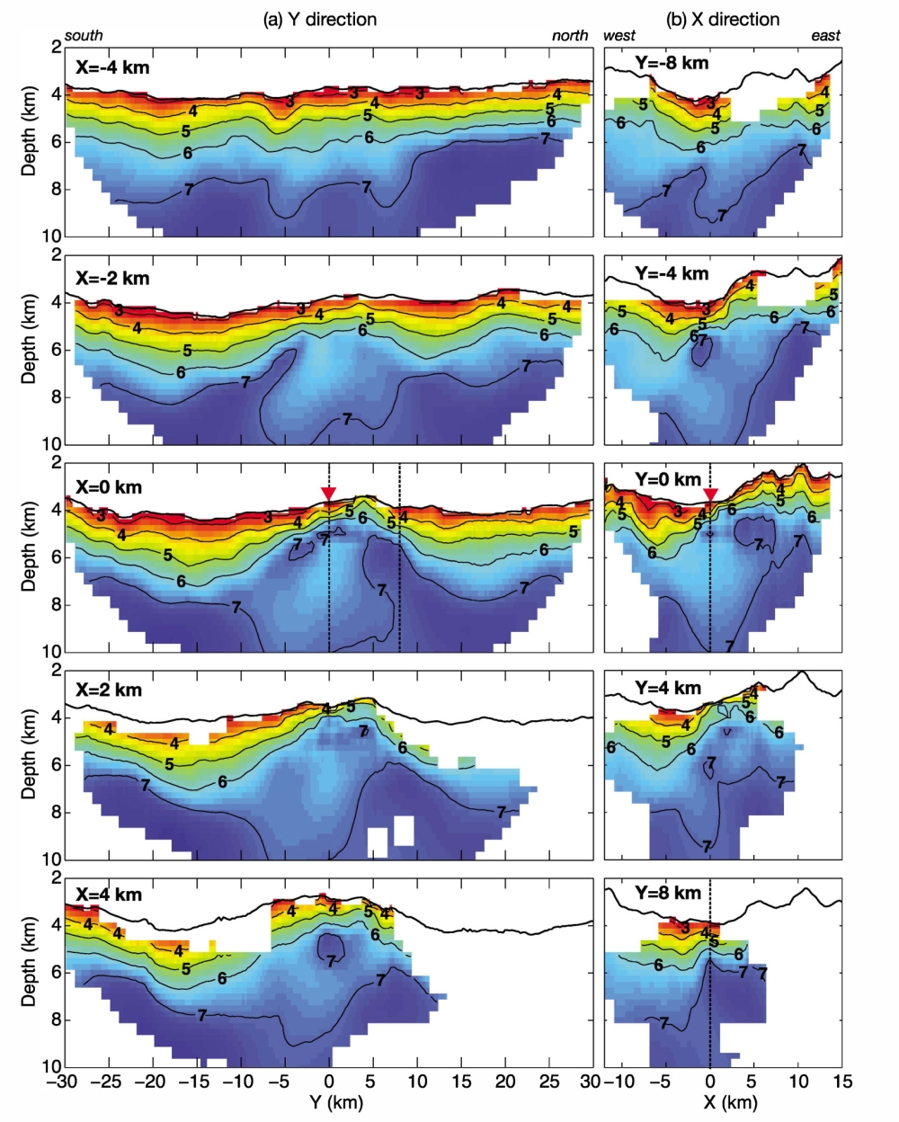 通过拾取不同的震相信息,利用迭代的射线追踪方法,获得了图7所示的P波速度模型:取X=-4,-2,0,2,4 km,Y=-8,-4,0,4 km处8个截断面展示结果,白色区域为0射线覆盖区,红色三角形位置为TAG热液活动区。