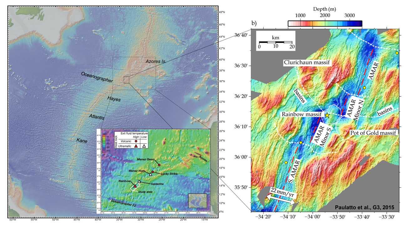 在Rainbow热液活动区大洋核杂岩中未发现存在活跃拆离断层的证据,Rainbow区的下地壳是沿洋中脊轴反复侵入小的熔融体形成,而不是通过大型岩浆房活动形成的,Rainbow地块由上隆的地幔物质构成,并被小的辉长岩体侵入。在热液活动区下方,流体循环主要受侵入岩体底部的小型冷却熔融体驱动,其通道为深部热裂隙及浅部断层网络。