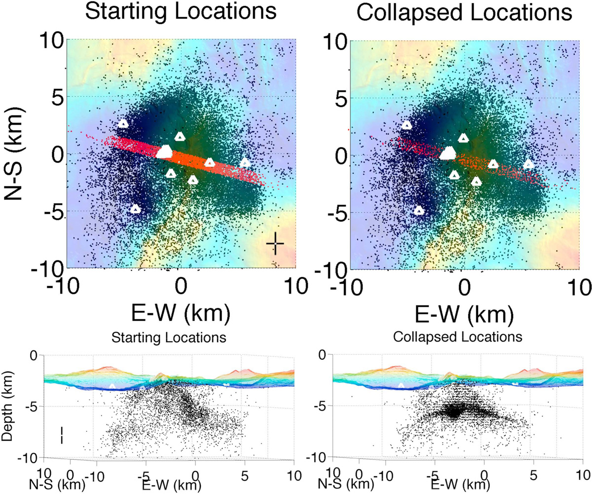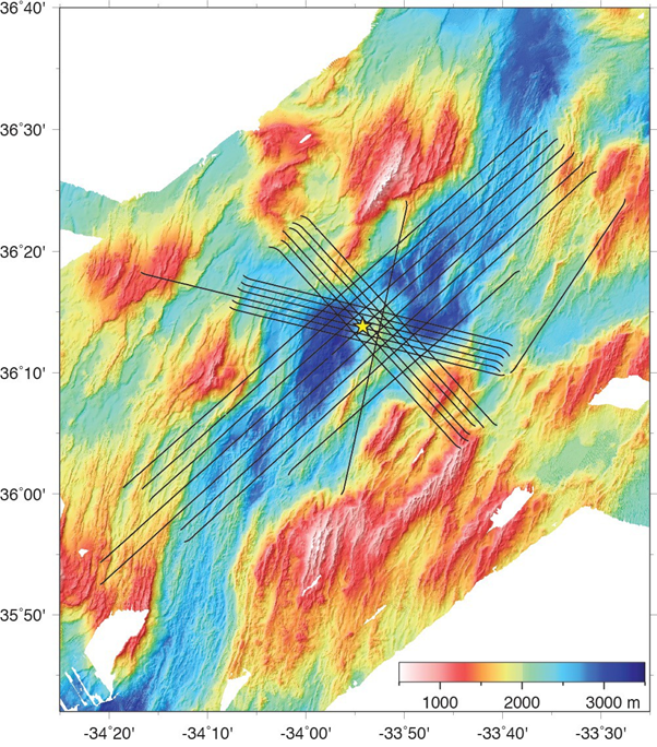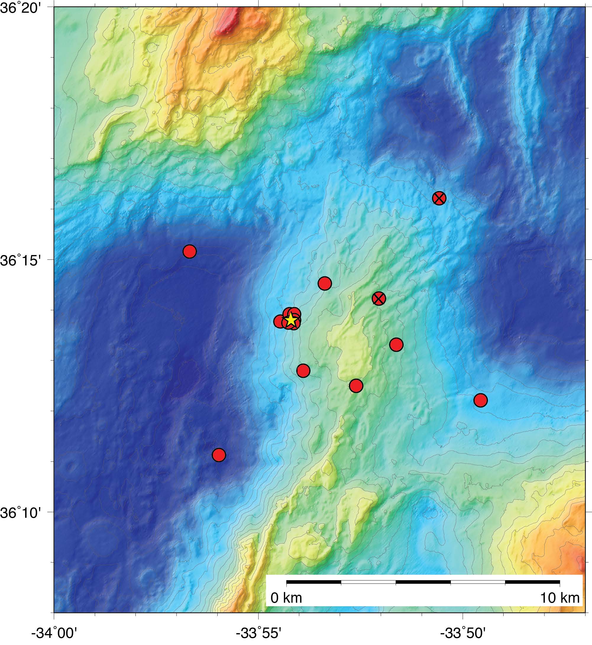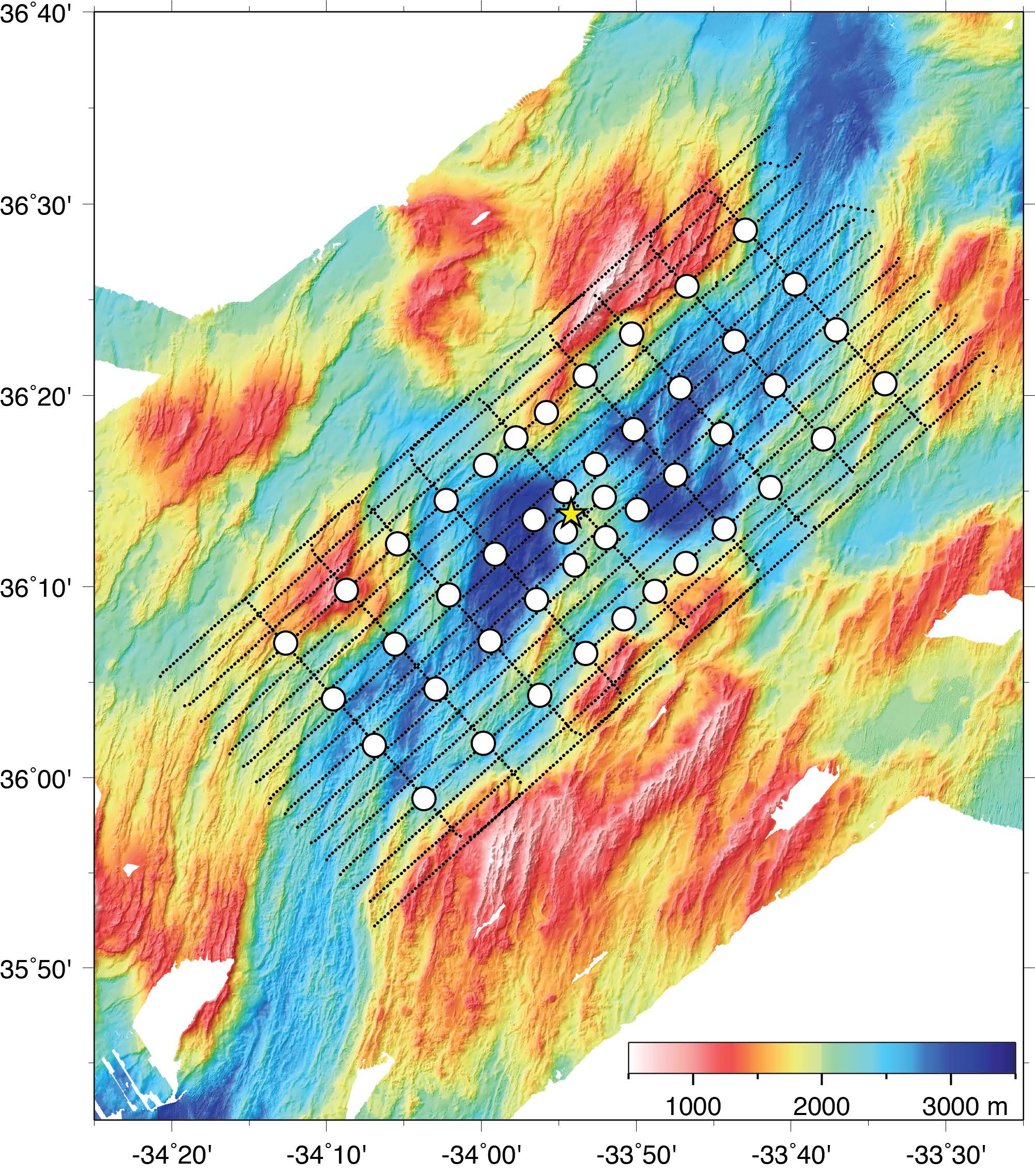 在Rainbow热液活动区共投放15台长期记录OBS(9个月)(图14),成功回收13台,共记录35000个地震事件。图15上图所示为震源定位位置坐标,底图为高程信息,白色三教代表OBS,坐标中心为Rainbow块体中心(33.88792°W,36.22967°N),下图是对应上图的震源分布横截面(红点区域)。