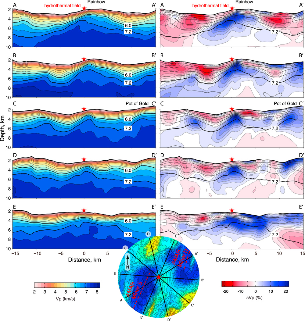 Canales J P, Dunn R A, Arai R, et al. Seismic imaging of magma sills beneath an ultramafic-hosted hydrothermal system[J]. Geology, 2017, 45(5): 451-454.(原文链接)