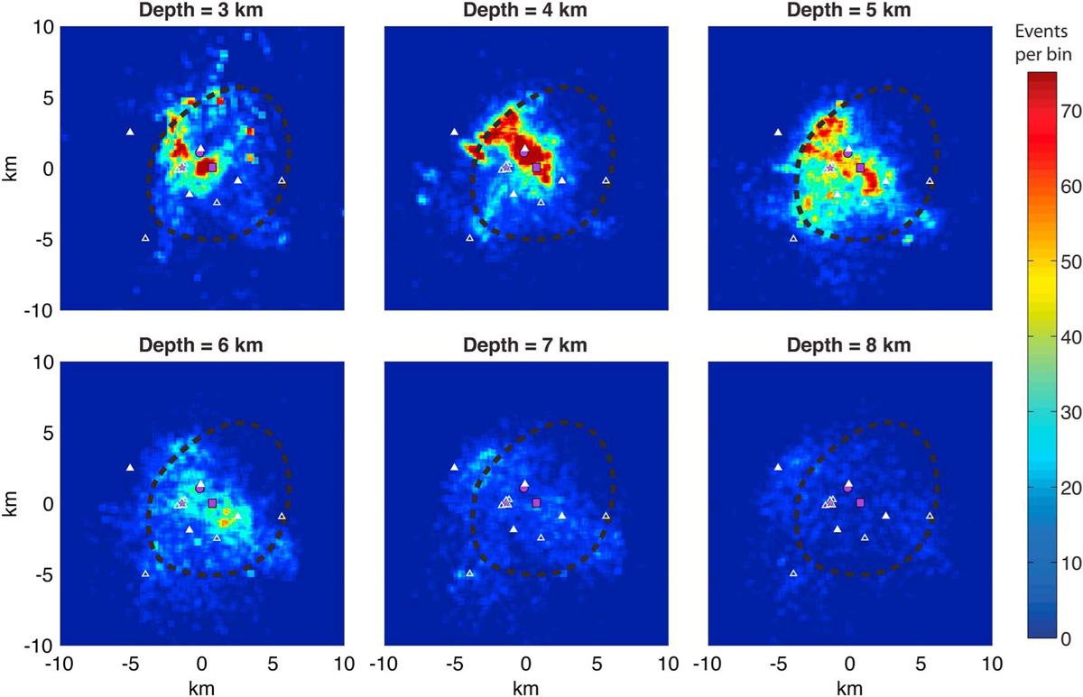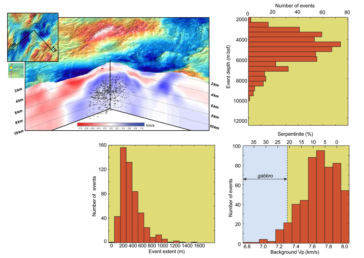 通过网格搜索方法在海平面以下不同深度的500米网格上确定地震事件密度(图16),白色三角位置为OBS,紫色五角星为热液喷口位置。超基性地块生成了大量的浅部小地震,蛇纹岩化可能是这些地震的成因。
