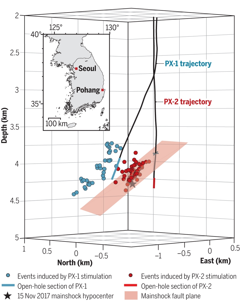 2017年11月15日,韩国浦项发生了MW5.5地震,造成约7500万美元的直接经济损失和至少3亿美元的间接经济损失。浦项地震是韩国有地震记录以来最大的破坏性地震,研究认为它与当地增强型地热系统的开发直接相关(见前沿报道《Science:韩国最大的Mw5.4破坏性地震可能为诱发地震》)。