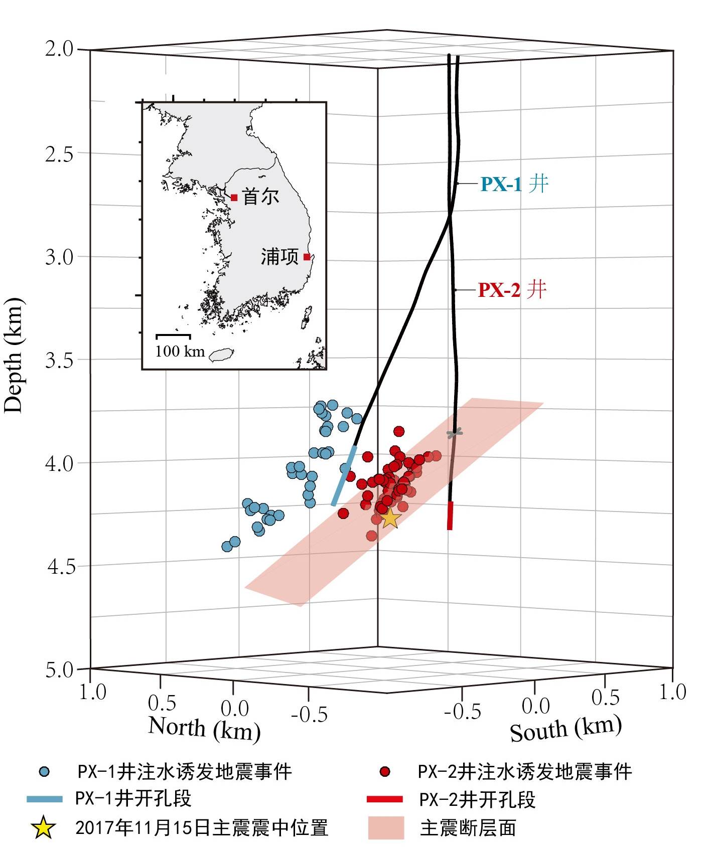 增强型地热系统是目前开发地球深部热能的常用技术,以浦项为例,通过向两口注水井PX-1和PX-2注水,可以使两口井之间的岩体产生新裂隙,或者使旧裂隙扩张,从而形成流体循环通道(图1),并在低渗透结晶基底区域形成人工地热田,预计的电力产能达1.2 MW。但是,PX-2井的高压注水活动诱发了一系列小地震,并最终激活了断层,引发地震。与浦项地热增强项目类似,在欧洲、加拿大、美国、中国、其他国家和地区,也都发生过地下注水诱发地震事件,同样造成了巨大的经济损失(Lei et al., 2017;van der Baan and Calixto, 2017)。