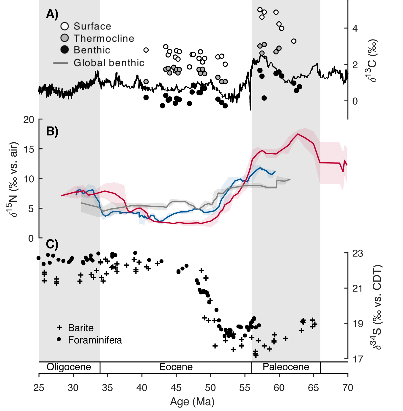 图3 新生代早期孔虫δ13C值(A)与 FB-δ15N记录(B)和重晶石、有孔虫碳酸盐晶格硫酸盐δ34S记录(Paytan et al., 1998; Rennie et al., 2018)(C)的对比。从古新世到始新世,底栖有孔虫δ13C值的总体下降可能表明有机质埋藏速率的降低,与大陆坡上方水体中较高的氧浓度是一致的(Kast et al., 2019, supplementary materials)