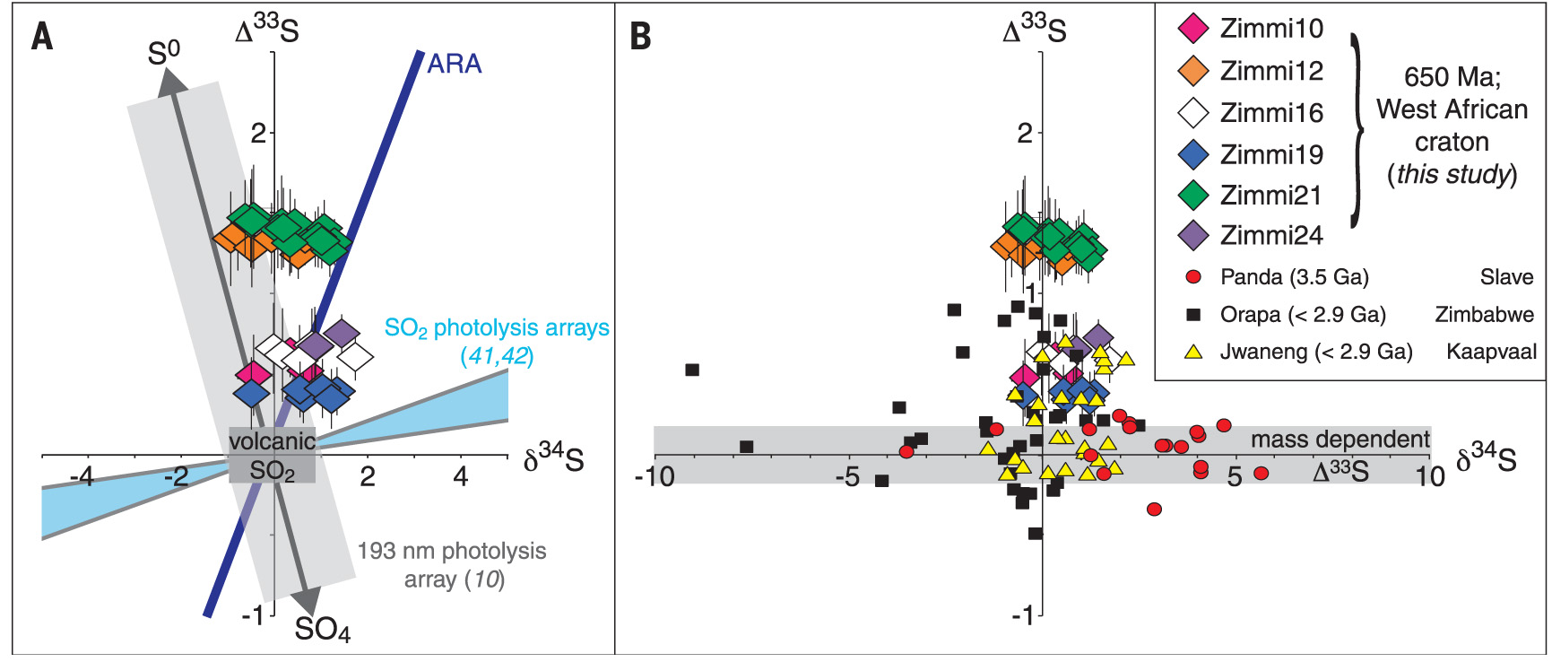图1 Zimmi硫化物包裹体中硫同位素的?33S和d34S值(Smit et al., 2019)。A. Zimmi硫同位素组成与实验值比较。MIF硫只能由太古宙紫外线辐射和光分解作用产生。B. Zimmi硫化物的硫同位素组成与其它产地金刚石中硫化物包裹体的硫同位素组成比较(Smit et al., 2019)