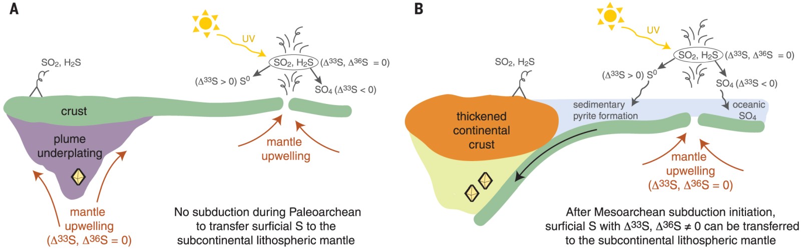 从全球范围来看,在太古宙俯冲开始之前,大气MIF硫没有进入地幔的渠道。在俯冲作用启动后,大气硫才能被吸收进入大陆岩石圈地幔并在金刚石中以硫化物包裹体的形式保存下来。产自加拿大Slave克拉通的古太古代(3.5 Ga)金刚石的硫化物包裹体不含MIF硫(Cartigny et al., 2009),表明冥古宙-太古宙原始Slave克拉通的形成没有地表硫的参与,即没有板块俯冲。随后在中太古代-新太古代克拉通生长和稳定期间,岩石圈发生马里亚纳型俯冲,Kaapvaal、津巴布韦和西非大陆岩石圈开始吸收大气硫,MIF硫特征被保存在年轻的金刚石中。由此可见,MIF硫是大陆岩石圈形成和改造的有力判别依据之一(图2)。