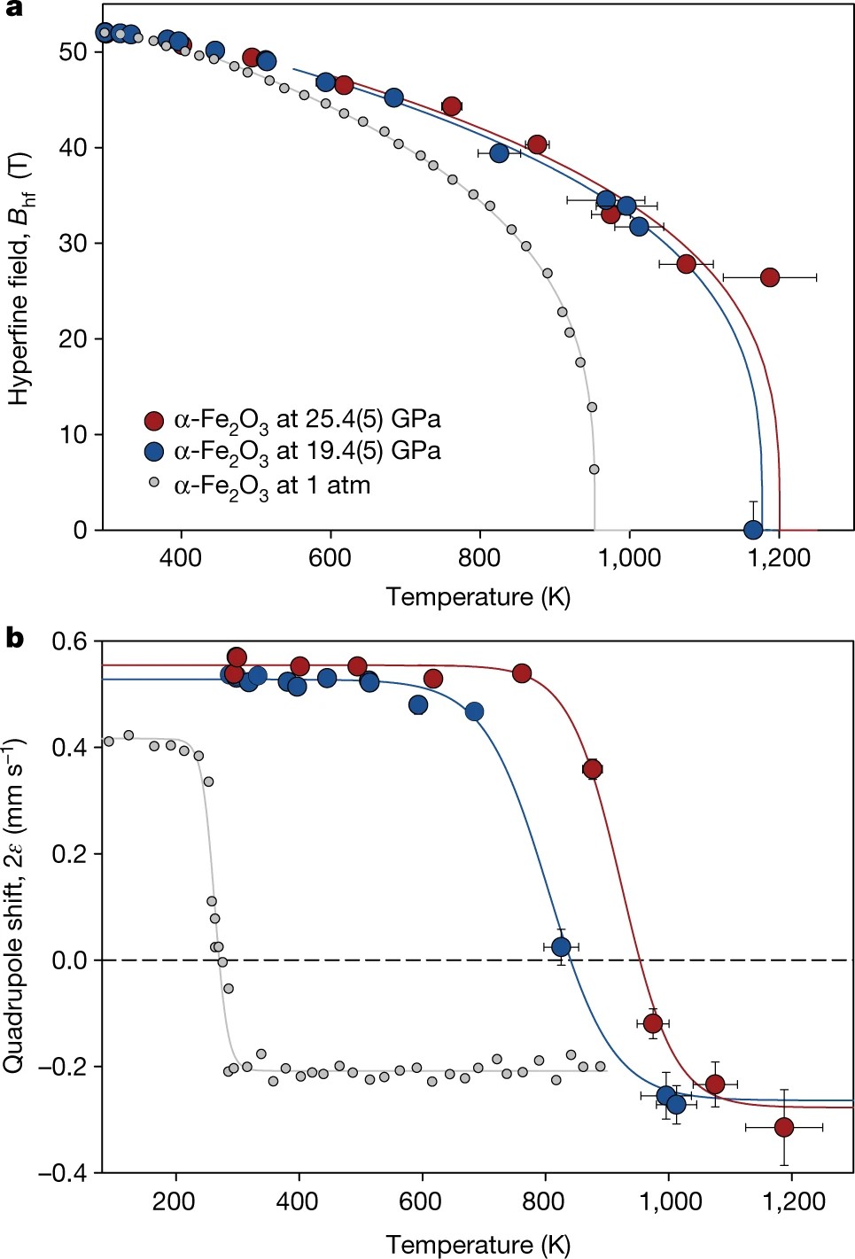 图1 α-Fe2O3的关键温度。a.特定压力下α-Fe2O3的超精细磁场随温度变化,尼尔温度通过拟合亚晶格磁化法实验中0.5Tc-0.99Tc之间数据获得;b.特定压力下四极移参数ε随温度变化,α-Fe2O3的ε在经过穆林转变温度时会减半并改变符号,从而可以推算穆林转变温度(Kupenko et al., 2019)