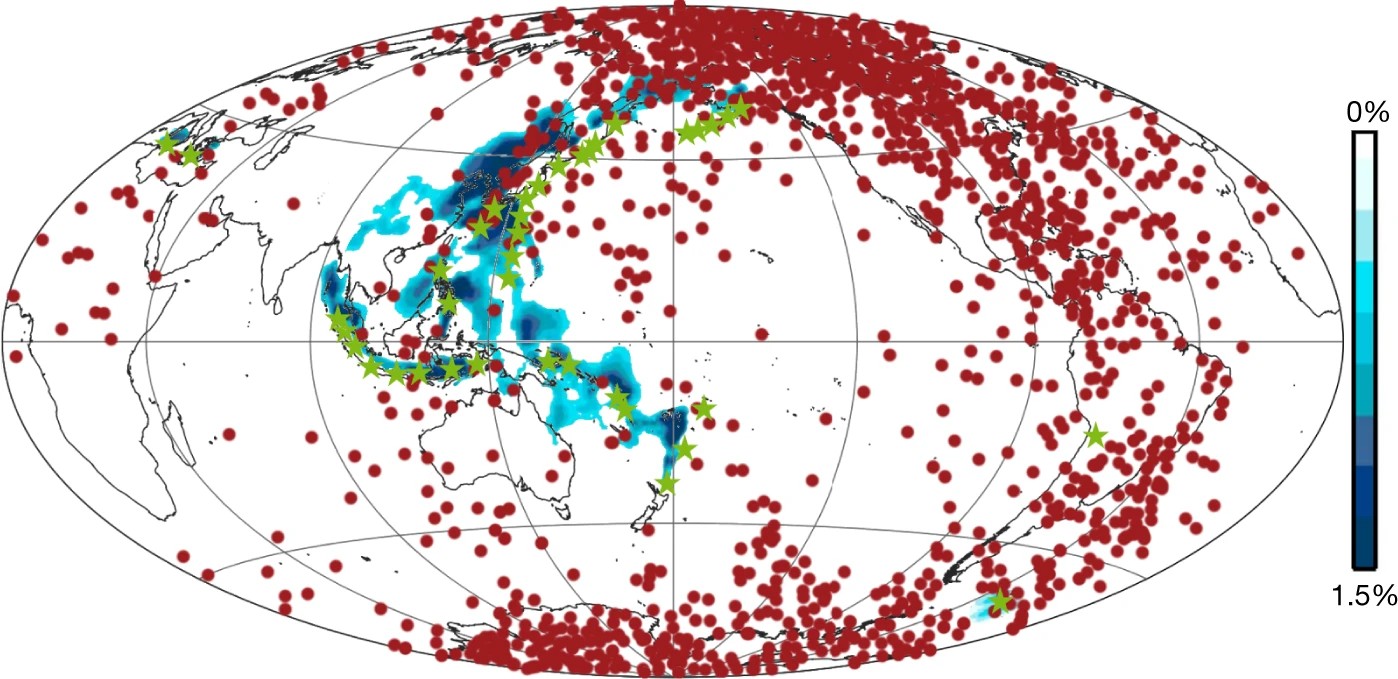 图3 磁转换期古地磁极位置分布图。~500 km深度温度低于赤铁矿尼尔温度的俯冲区域用绿色五角星表示。蓝色区域表示这些俯冲区500 km处P-波高速异常。红色圆点表示所选磁场倒转期的古地磁极移动路径,包括上奥杜威倒转(1.8 Ma)、6.5 Ma和 11 Ma的两次倒转、Blake事件(11.5-12 Ka)和一次漂移事件(Kupenko et al., 2019)