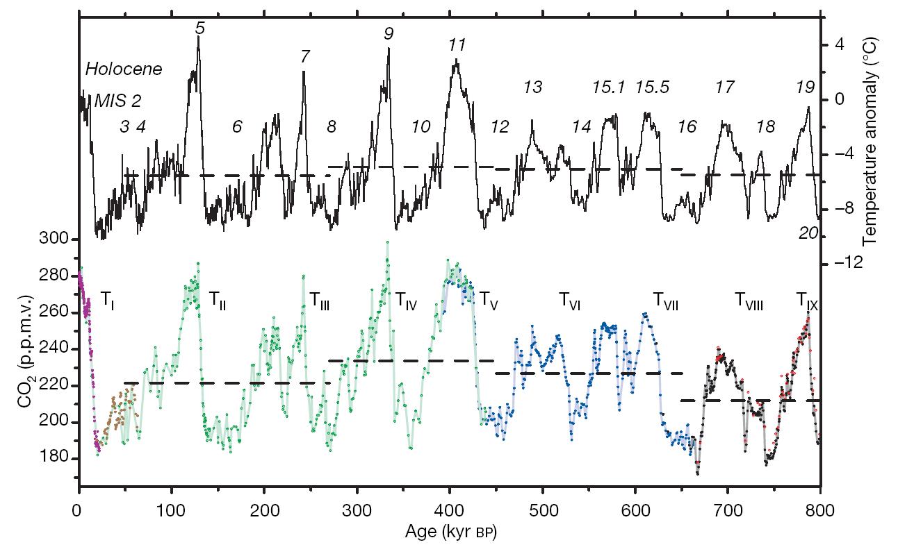 Lüthi D, Le Floch M, Bereiter B, et al. High-resolution carbon dioxide concentration record 650,000–800,000 years before present[J]. Nature, 2008, 453(7193): 379-382.(原文链接)
