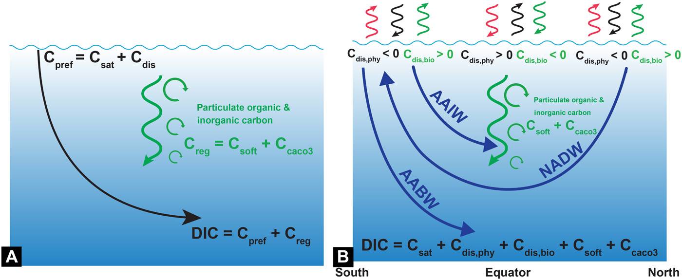 南极冰芯记录显示,冰期大气CO2浓度比间冰期平均低~90ppm(相当于~200Pg C),且CO2的变化与温度变化具有很好的一致性(Lüthi et al., 2008)(图1)。冰期消失的大气CO2去向何处?受哪些机制控制?这些问题一直是古气候学界亟需解决的重大科学问题。海洋碳库储量约为38000 Pg C(3.8×1019g C),相当于大气碳库的60多倍,通过海气交换,海洋生物量的变化以及海洋物理/化学状态的变化,是调控冰期-间冰期大气CO2变化的主要碳库。海洋无机碳库(DIC)的变化主要涉及到两个方面的碳循环过程:溶解泵和生物泵。温度决定CO2在海水中的溶解度,温度越低,CO2溶解度越大。当表层洋流将热带地区海水输送到高纬度地区时,海表水冷却,通过海气交换吸收大气中CO2,导致表层海水较高的即时溶解无机碳浓度(Cpref),并在高纬地区注入到深海,这一过程即为溶解泵(图2A)。生物泵(Creg)则指海洋浮游生物通过光合作用固定大气CO2,以颗粒有机物(软组织泵:Csoft)和无机碳(无机碳泵:CCaCO3)的形式下沉并矿化分解向深海输送溶解无机碳的过程(图2A)。