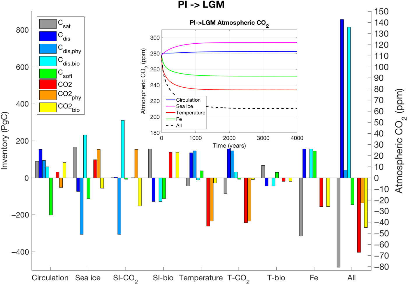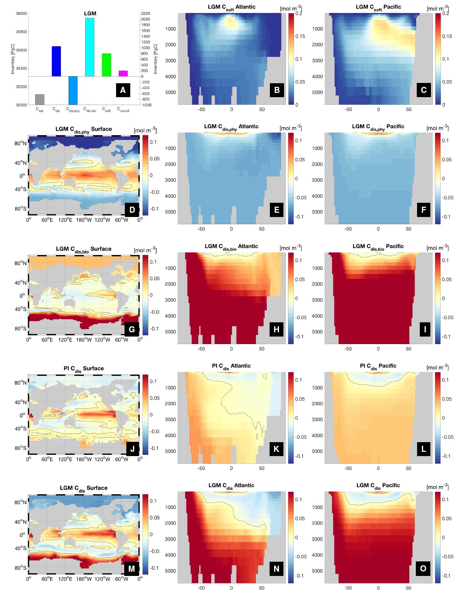图3 末次冰盛期(LGM)平衡模拟海洋碳组分。(A)溶解平衡组分(Csat)碳库(左纵坐标)及其他组分碳库(右纵坐标);(B-O)LGM及工业革命前(PI)表层海洋、大西洋和太平洋各组分碳组成(Khatiwala et al., 2019, supplementary materials)